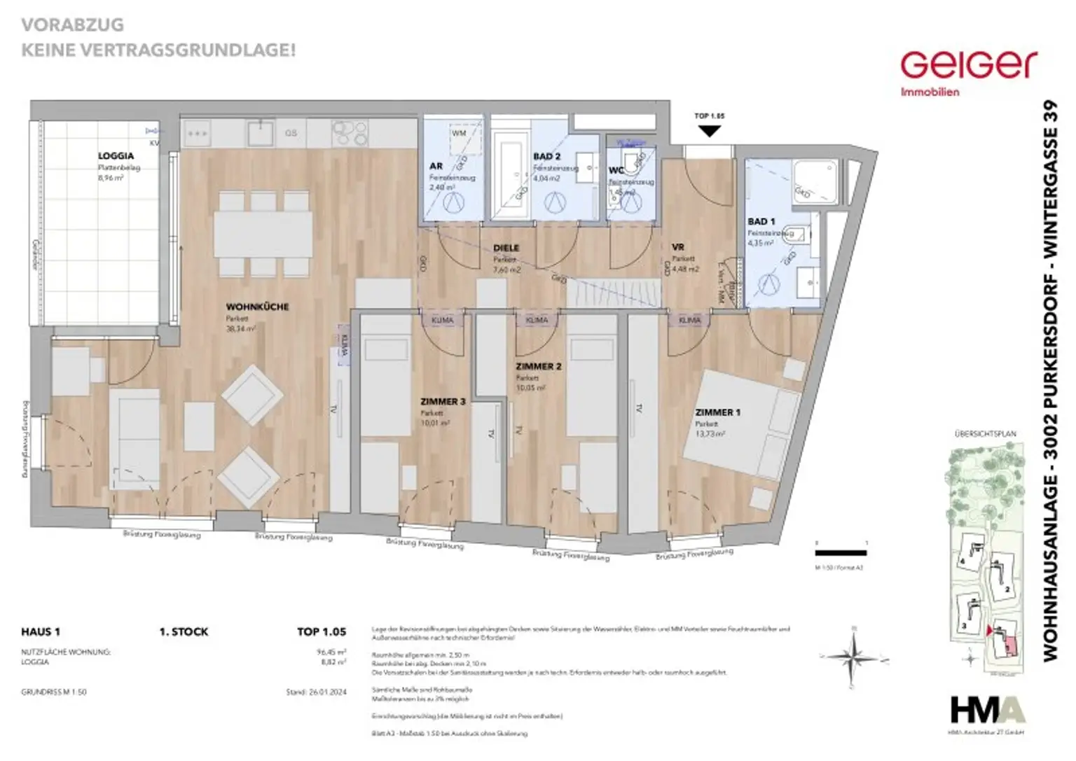 In der zentrumsnahen Wintergasse 39 im beliebten Purkersdorf, errichten wir eine moderne Wohnhausanlage. Diese fügt sich harmonisch in den Hang ein, besteht aus 4 Wohnhäusern mit insgesamt 48 Wohnungen (2-, 3-, 4- und 5-Zimmer Wohnungen), 74 KFZ-Tiefgaragenplätzen, sowie 8 Stellplätzen für Motorräder.