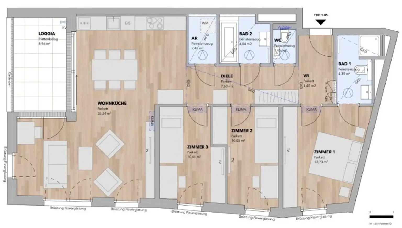 Ausstattung: Boden Bad Sauna Klimaanlage Fahrradraum Fußbodenheizung Loggia