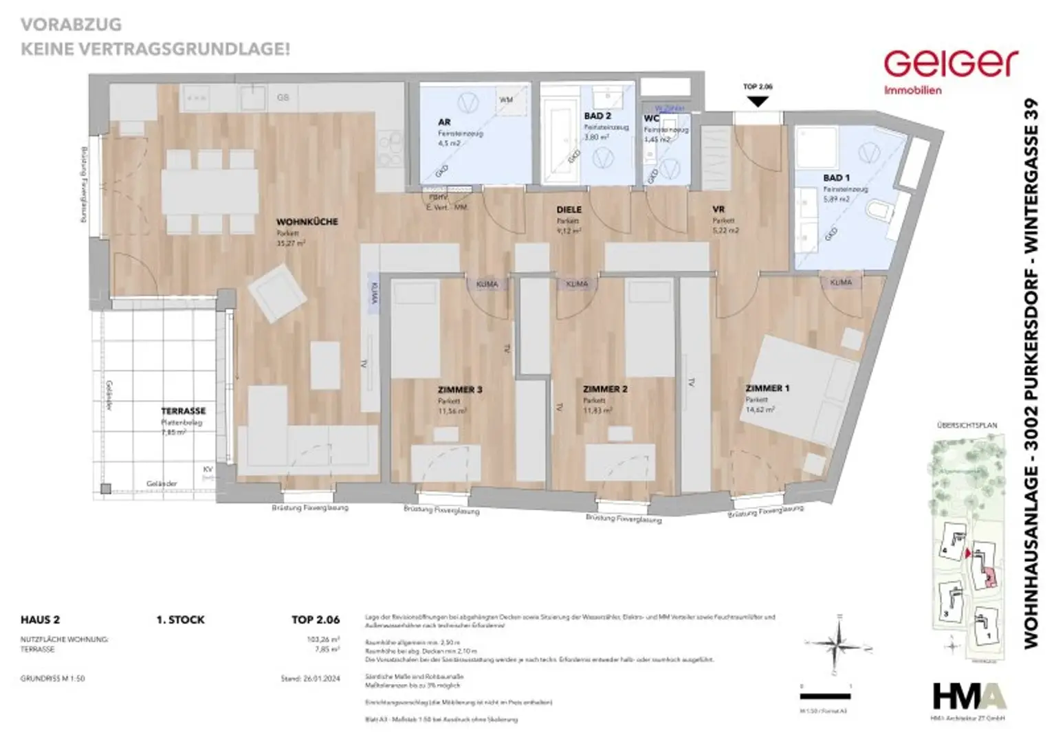 In der zentrumsnahen Wintergasse 39 im beliebten Purkersdorf, errichten wir eine moderne Wohnhausanlage. Diese fügt sich harmonisch in den Hang ein, besteht aus 4 Wohnhäusern mit insgesamt 48 Wohnungen (2-, 3-, 4- und 5-Zimmer Wohnungen), 74 KFZ-Tiefgaragenplätzen, sowie 8 Stellplätzen für Motorräder.