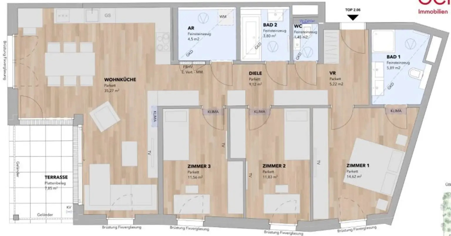 Ausstattung: Boden Bad Gäste-WC Sauna Klimaanlage Fahrradraum Abstellraum Fußbodenheizung Loggia
