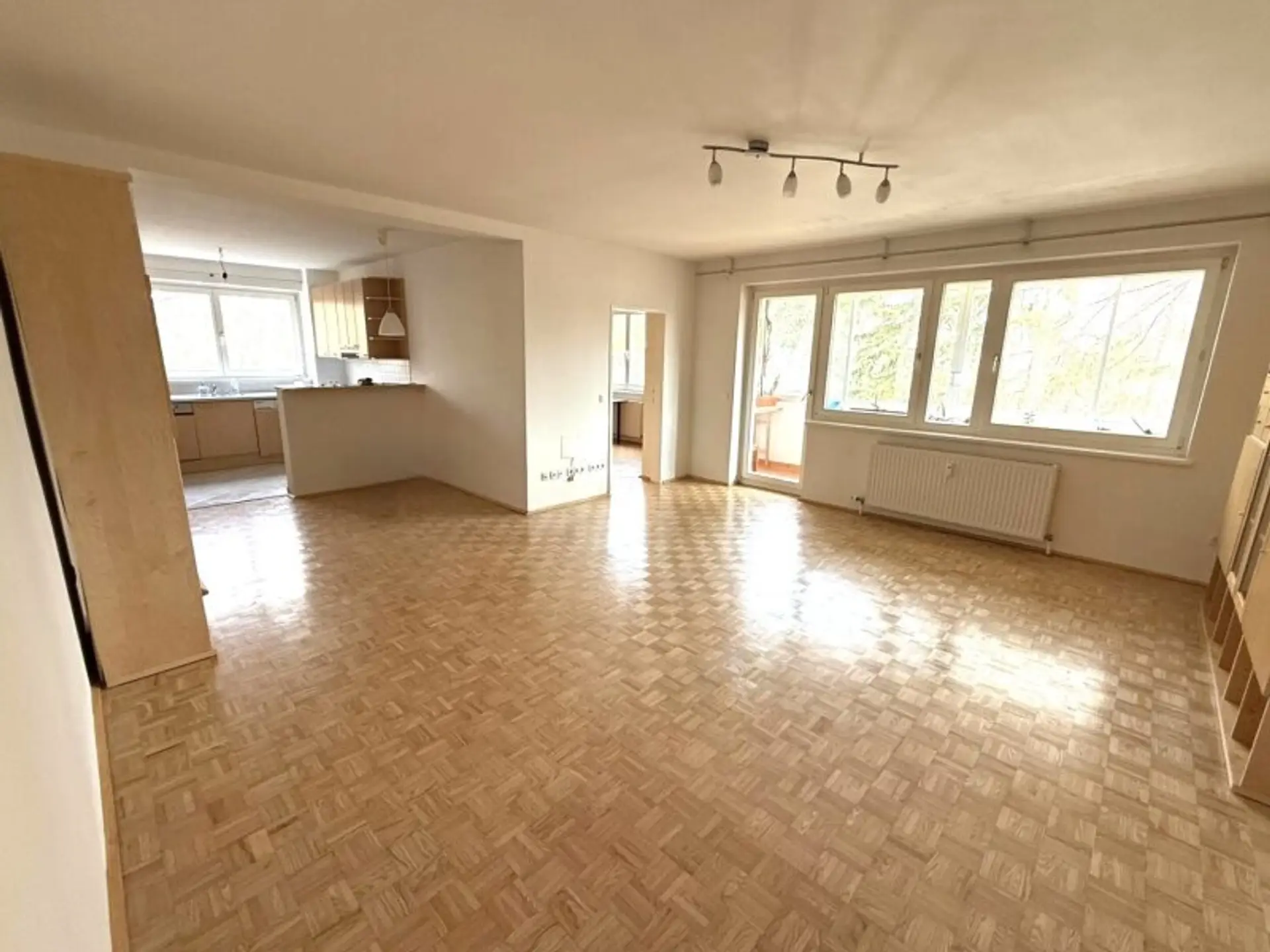 Das großzügige Wohnzimmer ist erweitert mit einem offenen Küchenbereich und Zugang zur Loggia.