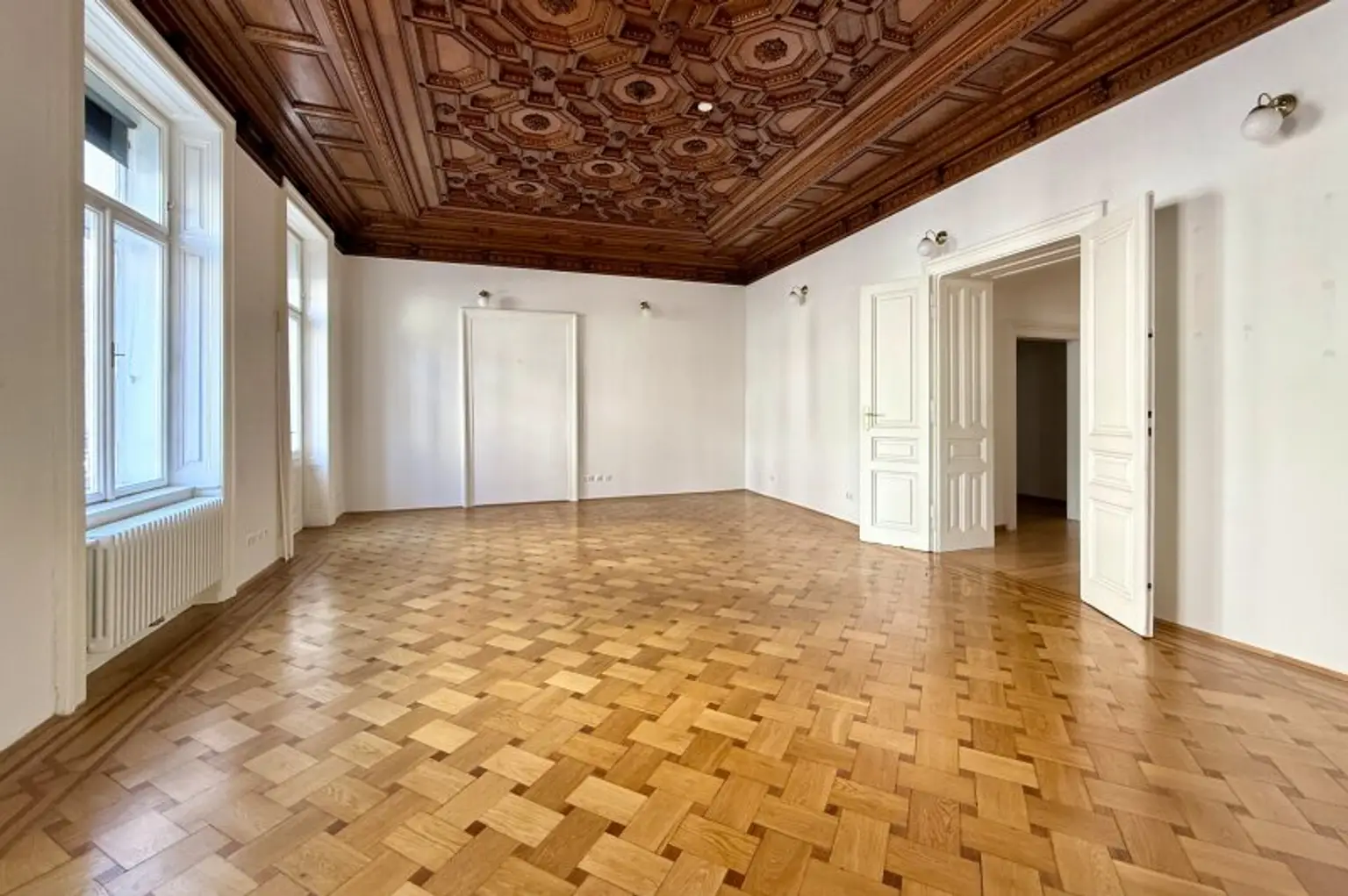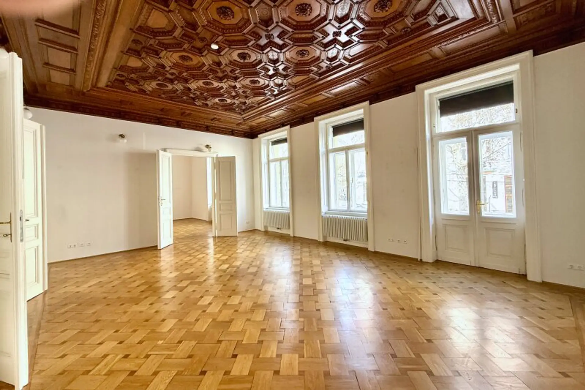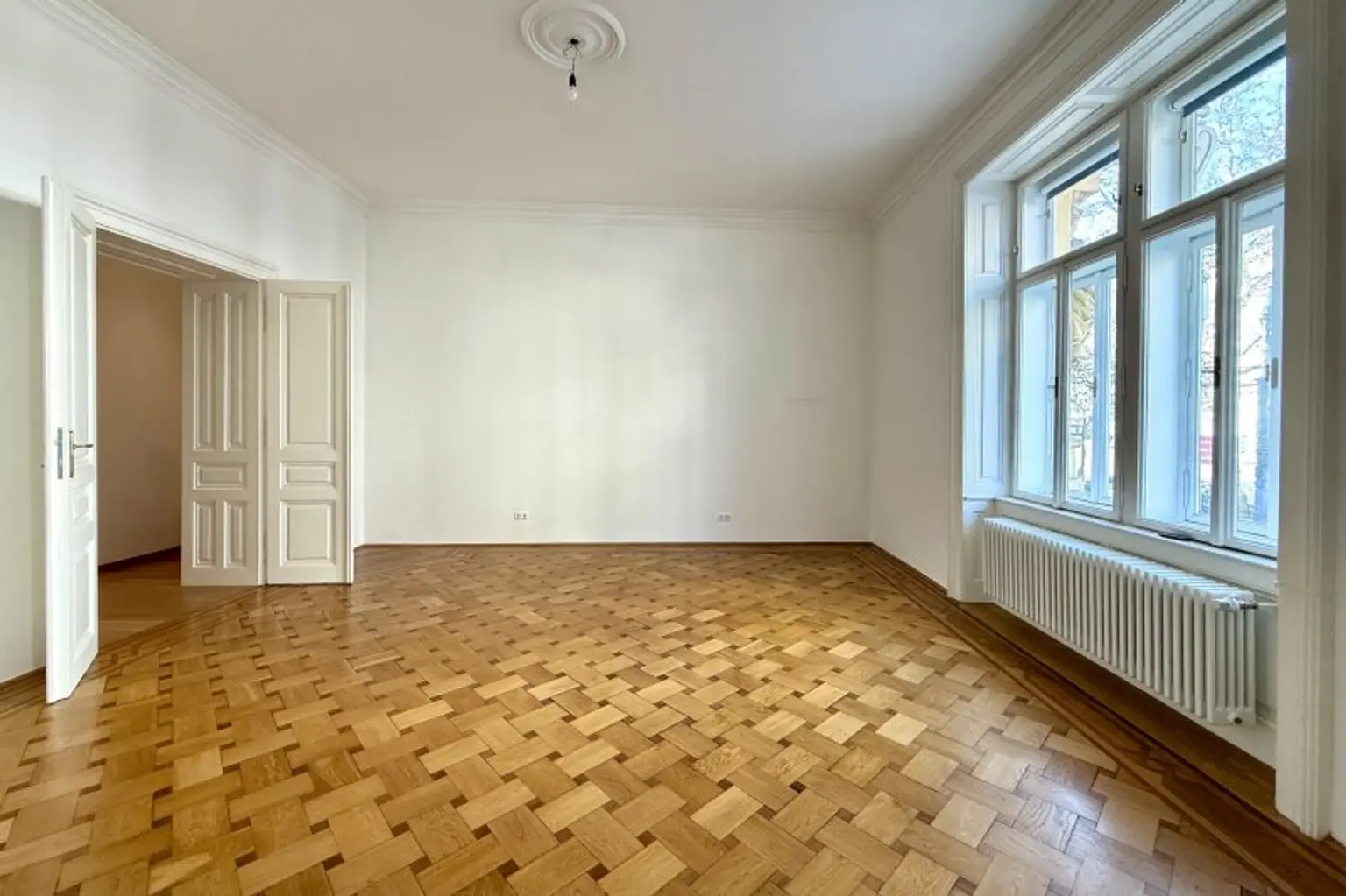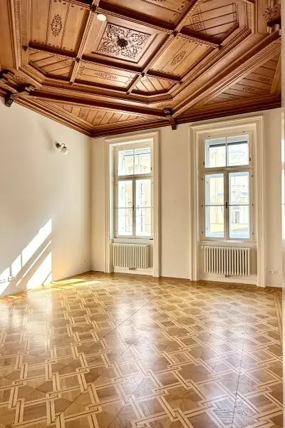 Liebevoll erhalten wurden auch die aufwändigen Holzdecken und Parkettböden, sowie die Flügeltüren. Die Wohnung bietet einen kleinen, straßenseitigen Balkon für den "Schritt nach draußen".