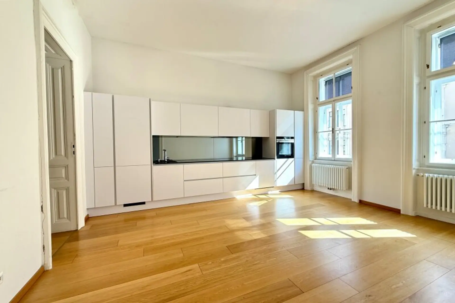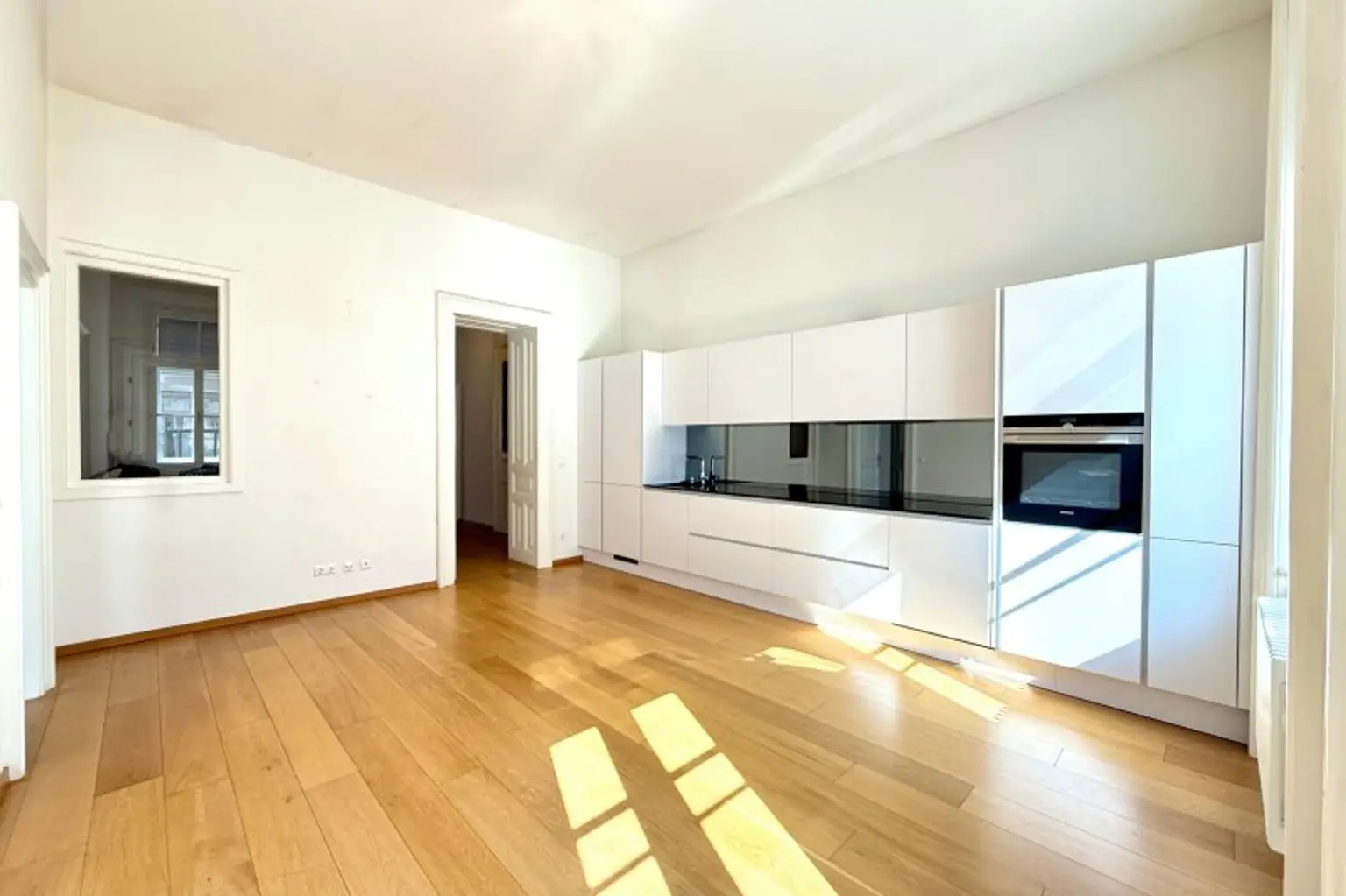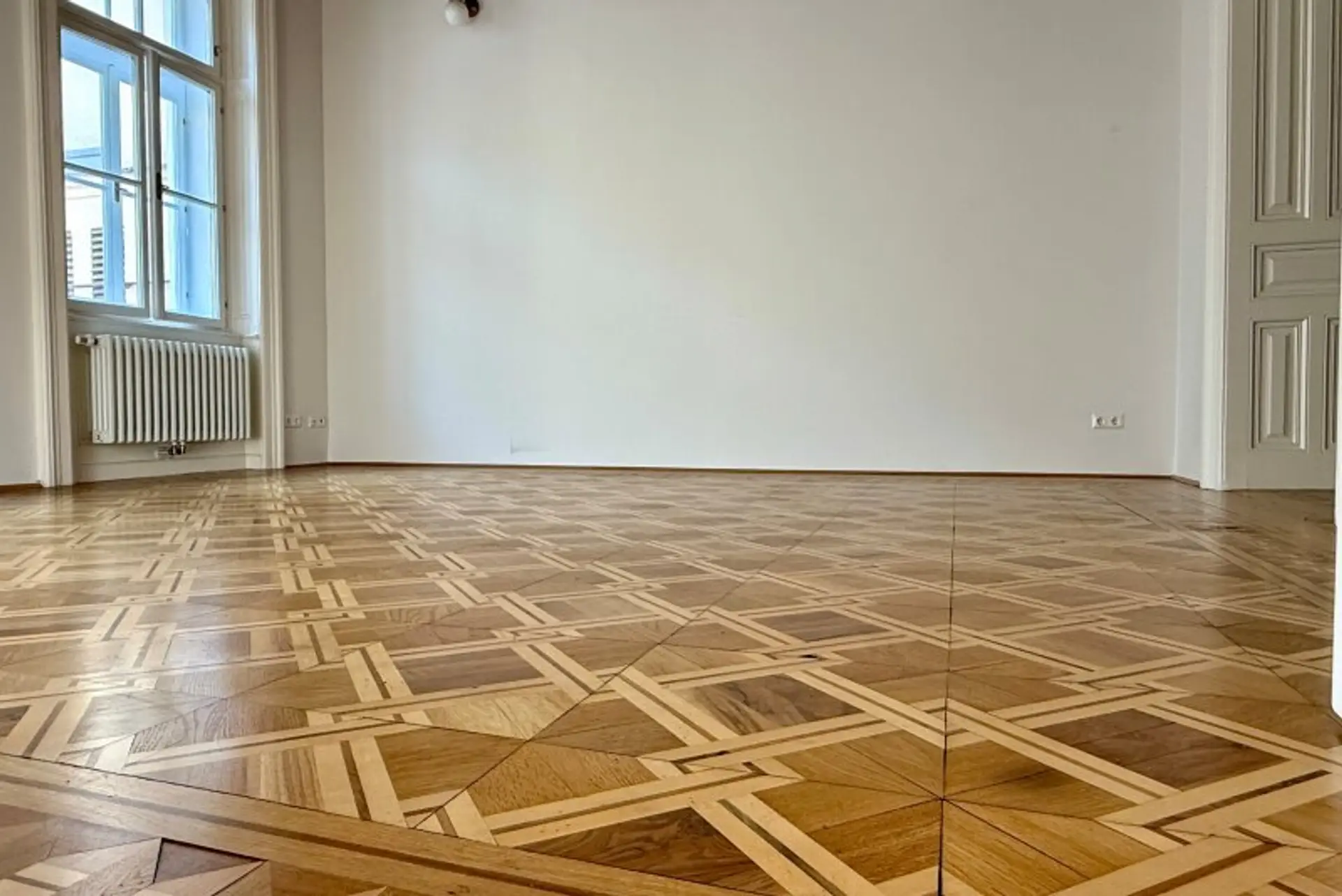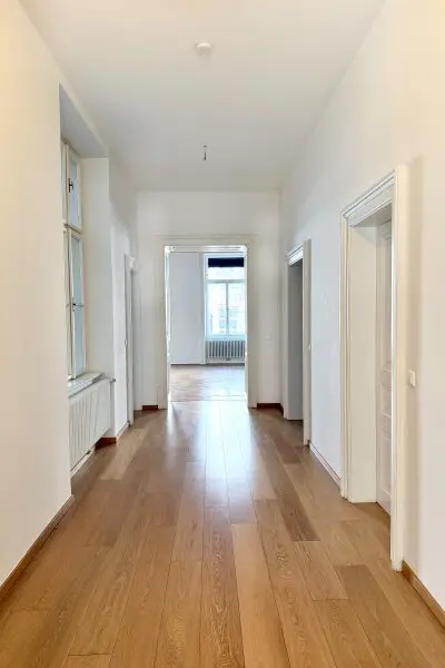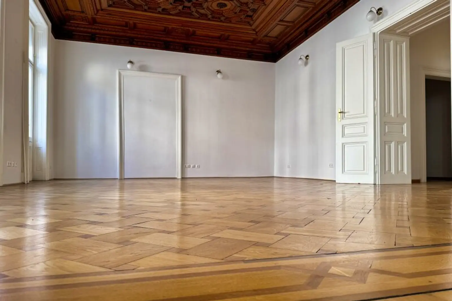 Liebevoll erhalten wurden auch die aufwändigen Holzdecken und Parkettböden, sowie die Flügeltüren. Die Wohnung bietet einen kleinen, straßenseitigen Balkon für den "Schritt nach draußen".