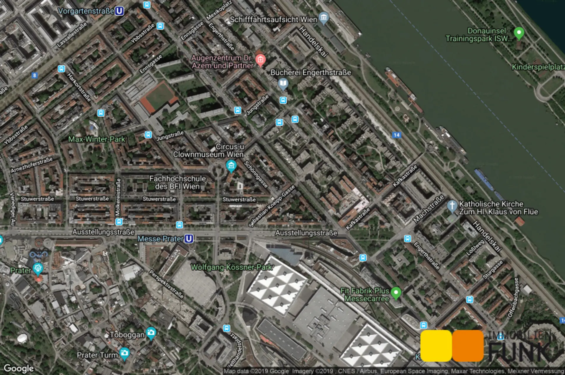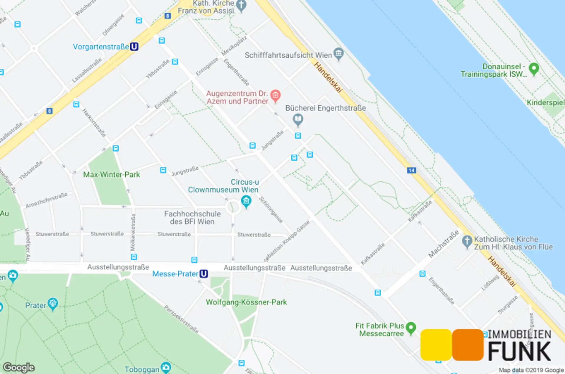 Die gegenständliche Liegenschaft liegt in einem aufstrebenden Teil des 2. Wiener Gemeindebezirks in der Schönngasse in unmittelbarer Nähe zum Wiener Prater und zur Messe Wien. Die U2-Station "Messe-Prater" befindet sich ca. 500 m, die U1-Station "Vorgartenstraße" ca. 700 m entfernt und sind somit zu Fuß in ein paar Minuten zu erreichen. Die nächstgelegenen Stationen der Buslinien 11A und 11B "Hillerstraße" und "Jungstraße" sind nur ein paar Schritte entfernt. Die Anbindung an das öffentliche Verkehrsnetz ist somit als ausgezeichnet zu beschreiben. Auch für den Individualverkehr ist das Objekt sehr gut gelegen. Sowohl die A22 (Donauufer Autobahn) als auch die A23 (Südosttangente) können sehr rasch erreicht werden. Die Fahrzeit in die Wiener Innenstadt (Stephansplatz) beträgt sowohl mit den öffentlichen Verkehrsmitteln als auch mit dem PKW ca. 15 Minuten. Die nächstgelegenen Einkaufsmöglichkeiten für Güter des täglichen Bedarfs (BILLA, EUROSPAR, LIDL etc.) sowie eine Apotheke sind in einem Umkreis von max. ca. 5 Minuten zu Fuß erreichbar. Nach einem anstrengenden Arbeitstag lädt der Wiener Prater zum Sporteln und Entspannen im Grünen ein.
