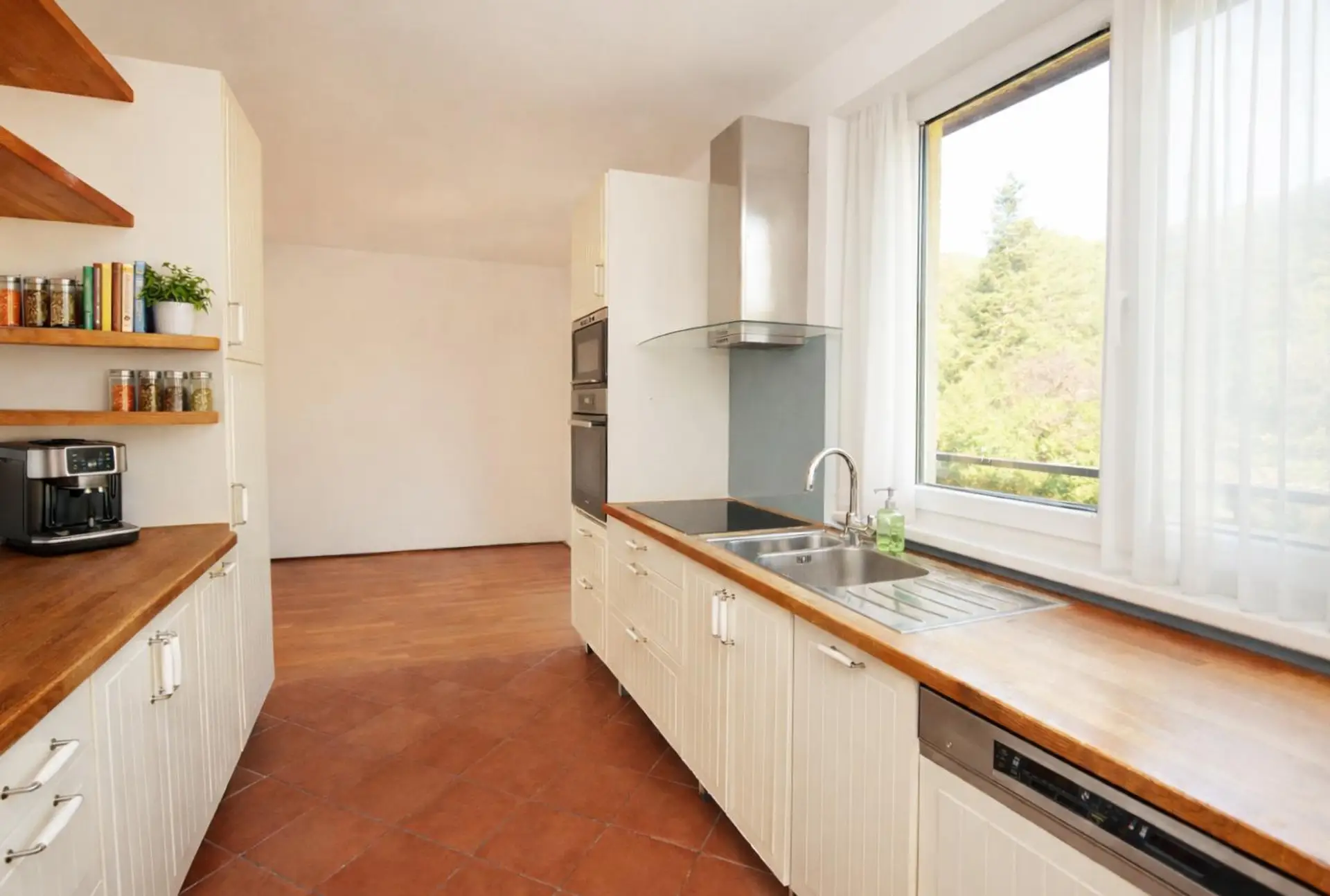 Der Küchenbereich ist separat angeordnet, die Küche ist voll ausgestattet und bietet zusätzlich Platz für einen kleinen Essbereich sowie Zugang zu einer weiteren Terrasse.