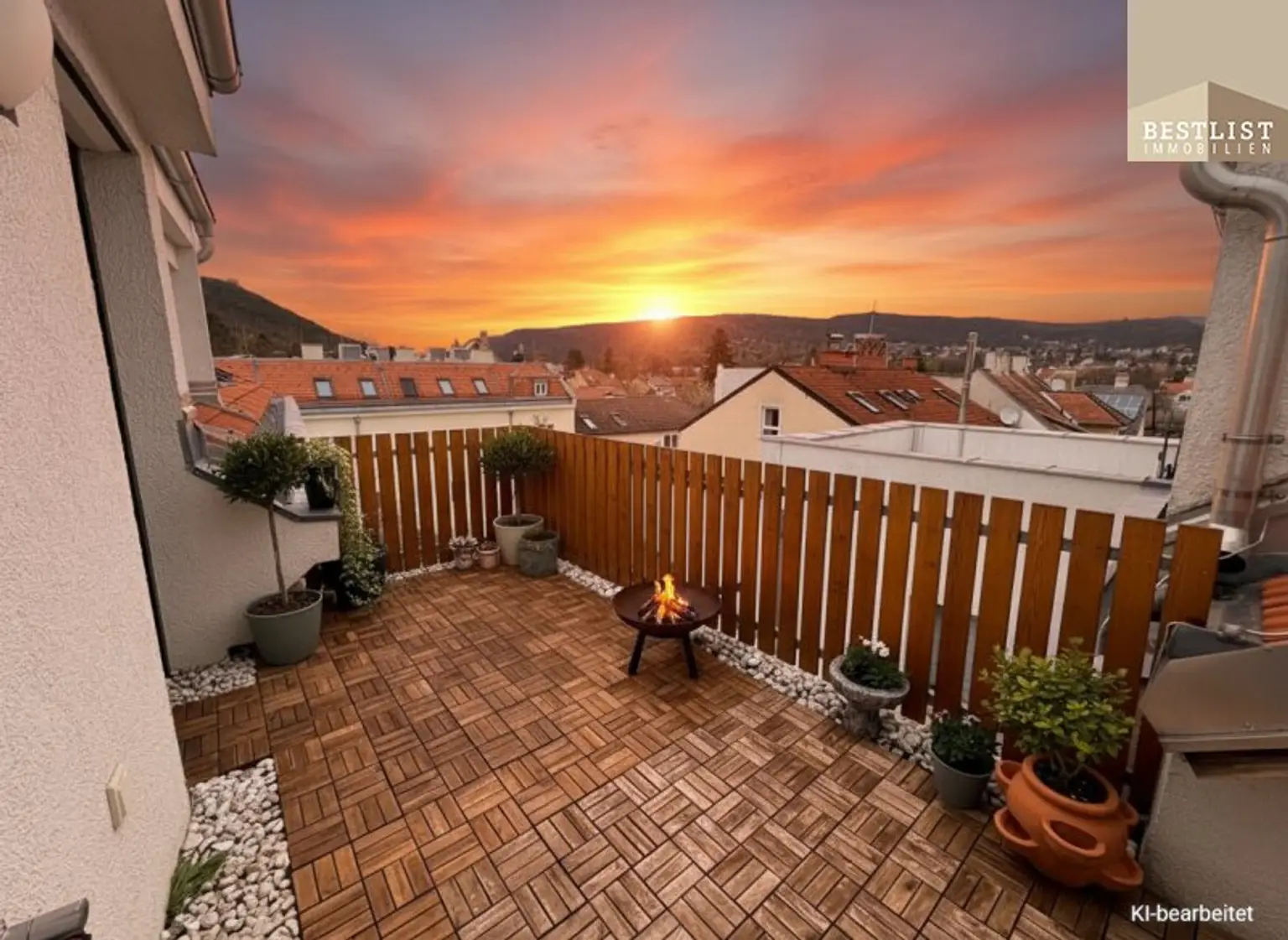 Die Terrasse ist ein Ort des Rückzugs – ideal, um bei einem Glas Wein den Blick über die Dächer Badens zu genießen oder in geselliger Runde den Abend ausklingen zu lassen. Der Fernblick verleiht diesem Platz eine besondere Leichtigkeit und macht ihn zum Highlight der Wohnung.