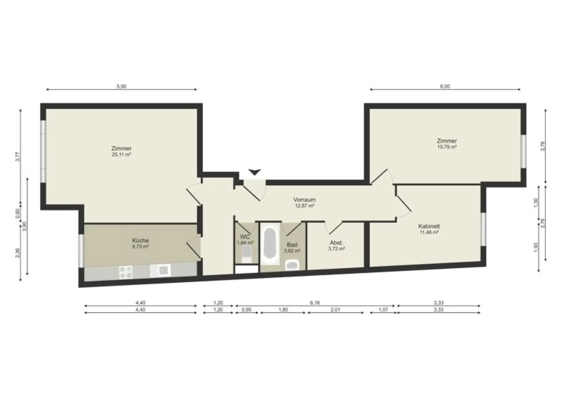 Alle Zimmer sind getrennt voneinander begehbar; WC und Bad sind ebenfalls getrennt und ein praktischer Abstellraum (inkl. Waschmaschinen-Anschluss) vervollständigt das Angebot. Die Wohnung ist Ideal für eine Familie mit einem Kind, oder eine WG.