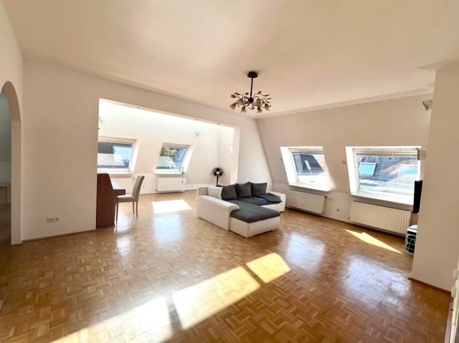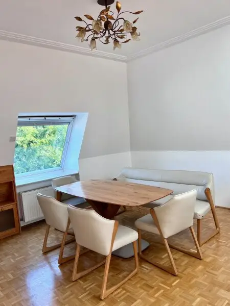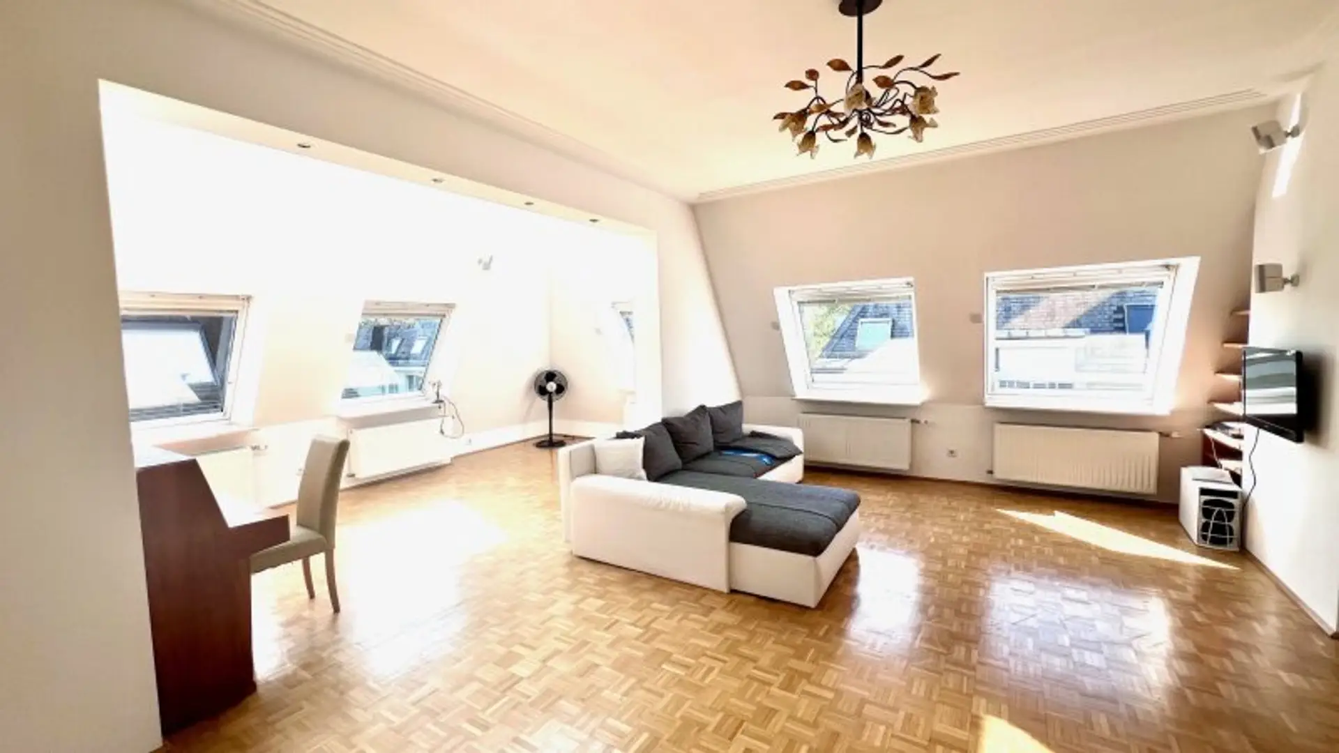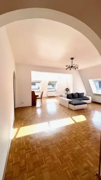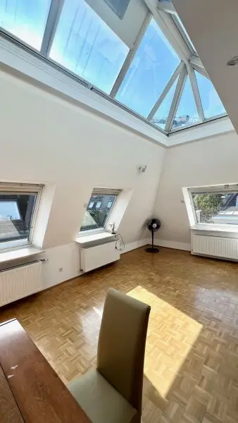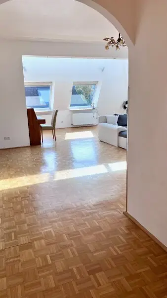 Man betritt die 4-Zimmer-Dachgeschosswohnung über das helle gepflegte Stiegenhaus und einen Vorraum, von welchem sämtliche Räumlichkeiten zentral begehbar sind. Das Vorzimmer mit etwa 10 m² Größe bietet guten Platz für eine Garderobe und Schuhschränke. Gleich nach dem Eintreten liegt zur Rechten das Herzstück der Wohnung, das Wohnzimmer mit über 45 m² Wohnfläche, großen Dachschrägen-Fenstern und einer gläsernen Lichtkuppel (zum Öffnen und mit Beschattung). Dadurch erstrahlt dieser Raum in ganz besonderem Licht und mit einzigartigem Flair.