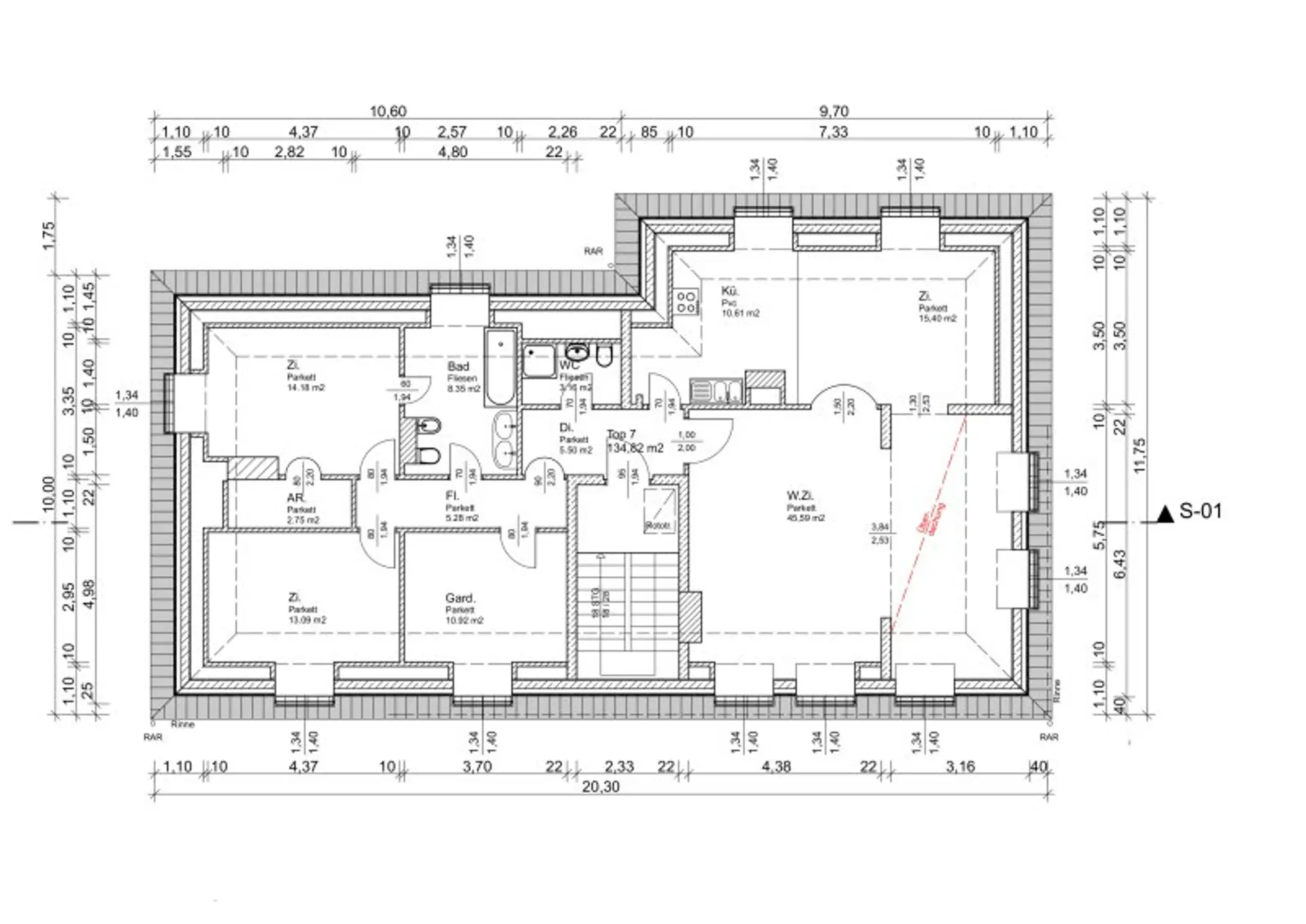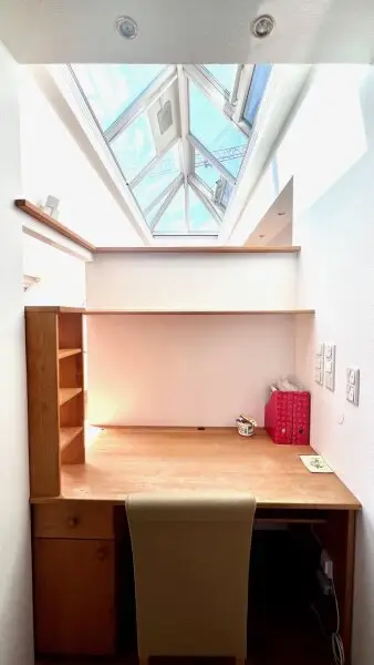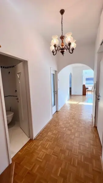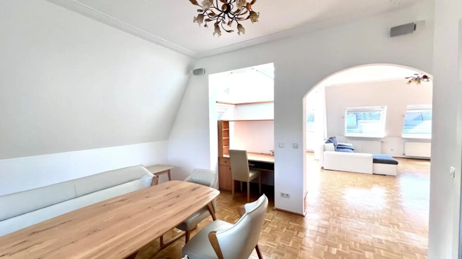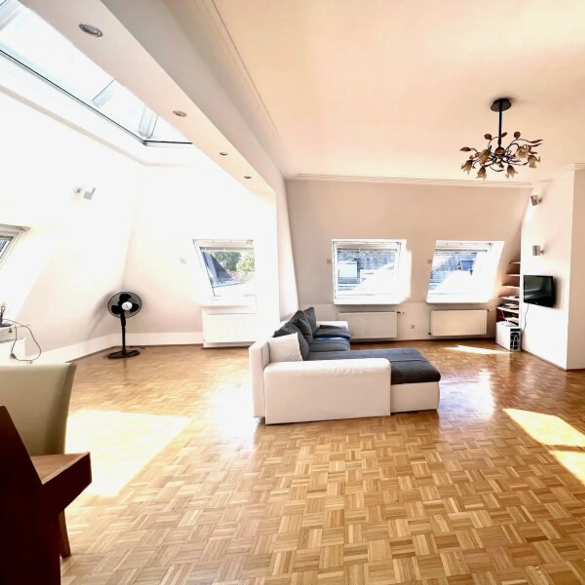 Man betritt die 4-Zimmer-Dachgeschosswohnung über das helle gepflegte Stiegenhaus und einen Vorraum, von welchem sämtliche Räumlichkeiten zentral begehbar sind. Das Vorzimmer mit etwa 10 m² Größe bietet guten Platz für eine Garderobe und Schuhschränke. Gleich nach dem Eintreten liegt zur Rechten das Herzstück der Wohnung, das Wohnzimmer mit über 45 m² Wohnfläche, großen Dachschrägen-Fenstern und einer gläsernen Lichtkuppel (zum Öffnen und mit Beschattung). Dadurch erstrahlt dieser Raum in ganz besonderem Licht und mit einzigartigem Flair.