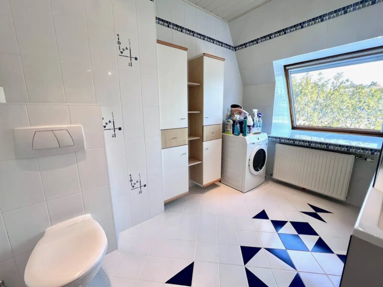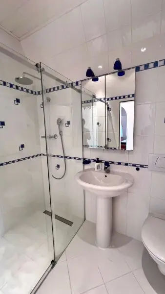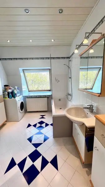 Die Liegenschaft hat zwei getrennte Badezimmer, welche beide über eine Toilette verfügen. Wobei das kleinere der Bäder (3 m²) mit einer Duschkabine und einem Handwaschbecken, das Größere mit über 8 m² mit einer Badewanne, einem Handwaschbecken samt Waschtisch sowie einer Waschmaschine ausgestattet ist.