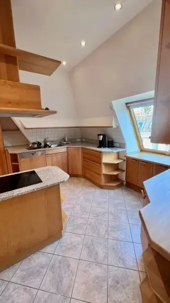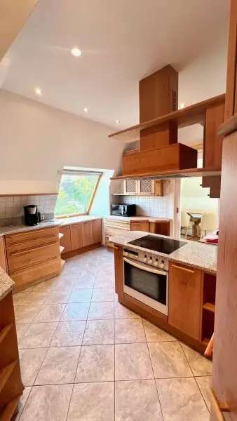 Der Essbereich mit über 15 m² liegt separat und ist gekonnt vom Wohnzimmer und der angeschlossenen Vollholz-Küche getrennt. Auch die Küche weist eine stattliche Größe von über 10 m² auf und ist mit sämtlichen Geräten des heutigen Standards ausgestattet. Die Küche ist einerseits vom Esszimmer, aber auch praktisch nach dem einkaufen über den Eingangsbereich der Wohnung zu erreichen. Hier "versteckt" sich gekonnt in die Küche integrier, eine Vaillant-Therme, welche erst im März 2024 in Betrieb genommen wurde.
