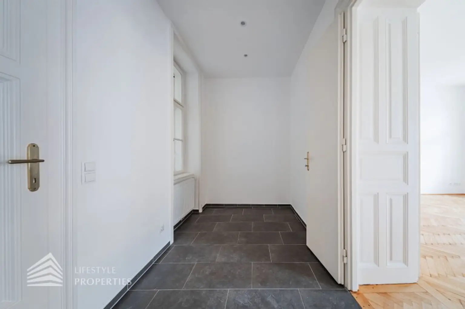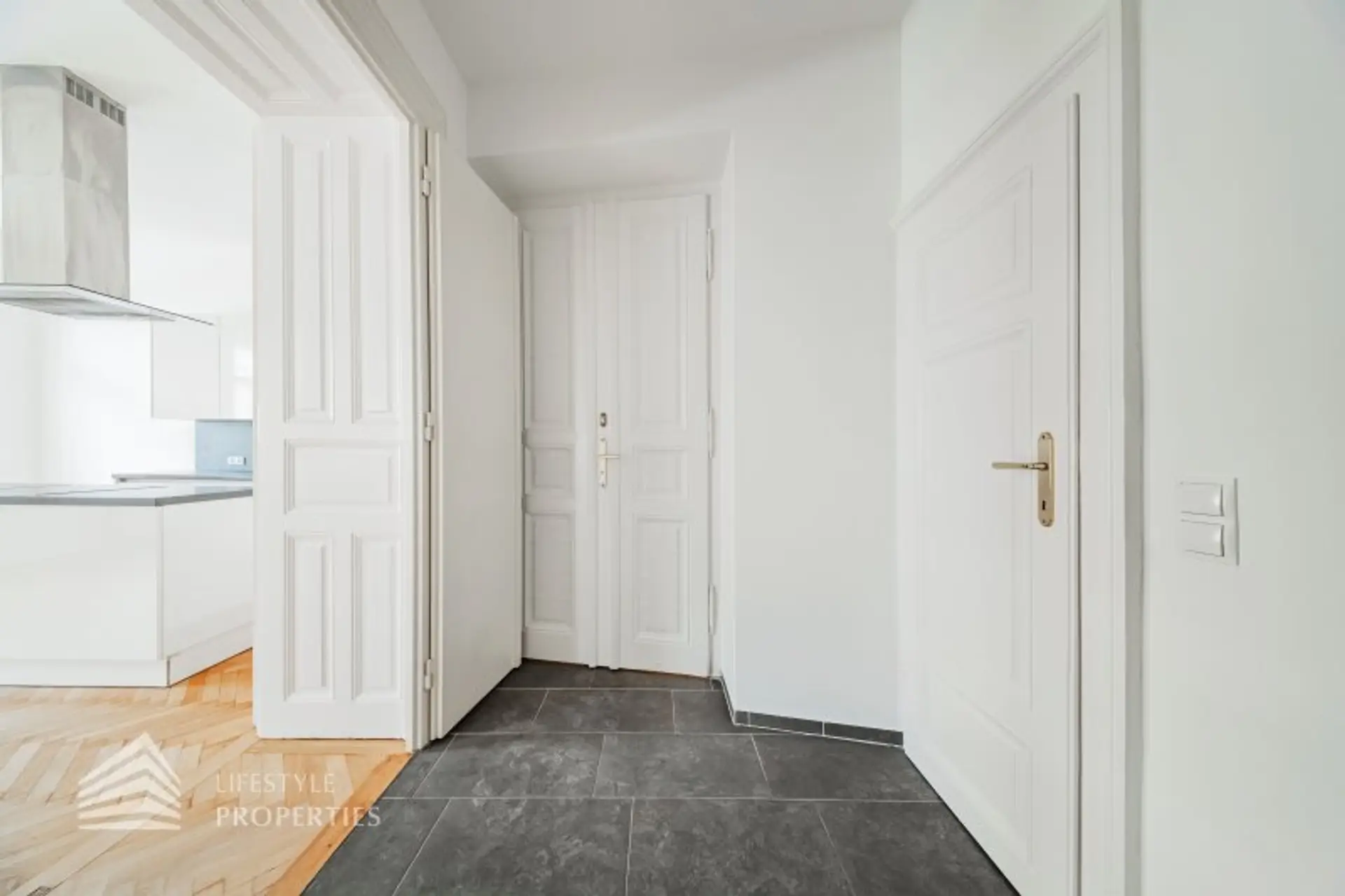 Sie betreten die Wohnung und befinden sich im etwa 7 m² großen Vorraum. Gleich links vom Eingang befindet sich das WC. Dahinter liegt das Badezimmer, ausgestattet mit einer Badewanne, Handtuchhalter, Waschbecken und einem Fenster. Rechterhand vom Vorraum betritt man die über 30 m² große Wohnküche, mit zwei separaten Zugängen zum Schlazimmer (vom Bad und von der Wohnküche). Der Wohnbereich ist durch eine moderne, gradlinige Küche mit Kochinsel ergänzt - mit weissen Fronten, dunkler Arbeitsfläche und integrierter Dampfabzugslösung.