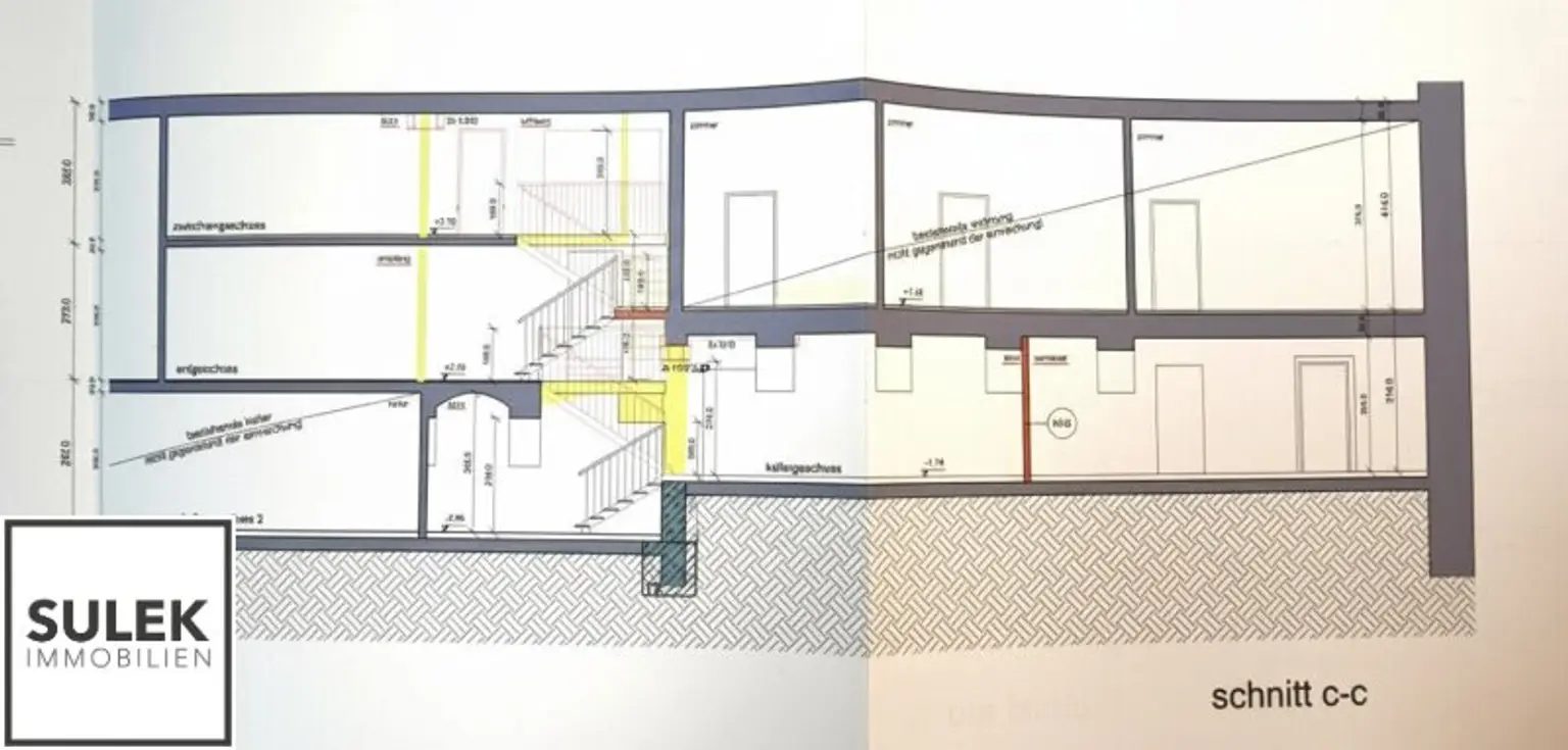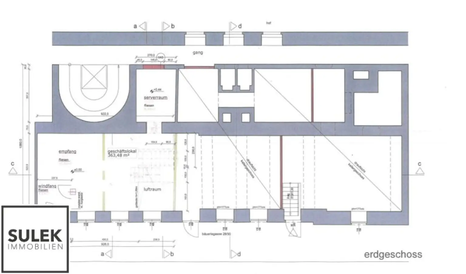 * zwei Straßeneingänge (EG und Souterrain) sowie über Stiegenhaus