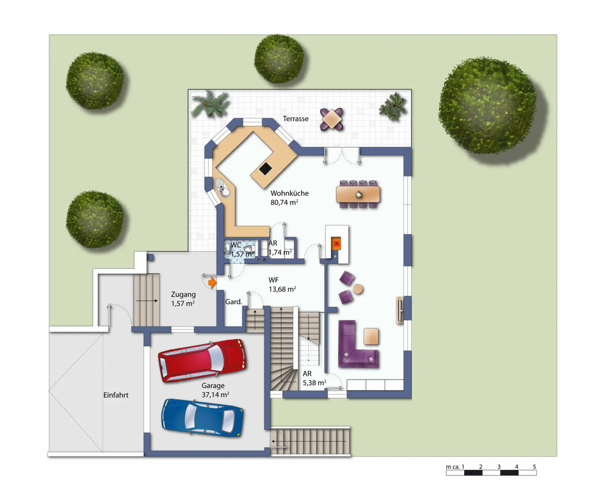 Umfassende Infrastruktur: Einkaufsmöglichkeiten, Gastronomie, Schulen, Kindergärten sowie Ärzte und Apotheken sind im Ort vorhanden.
