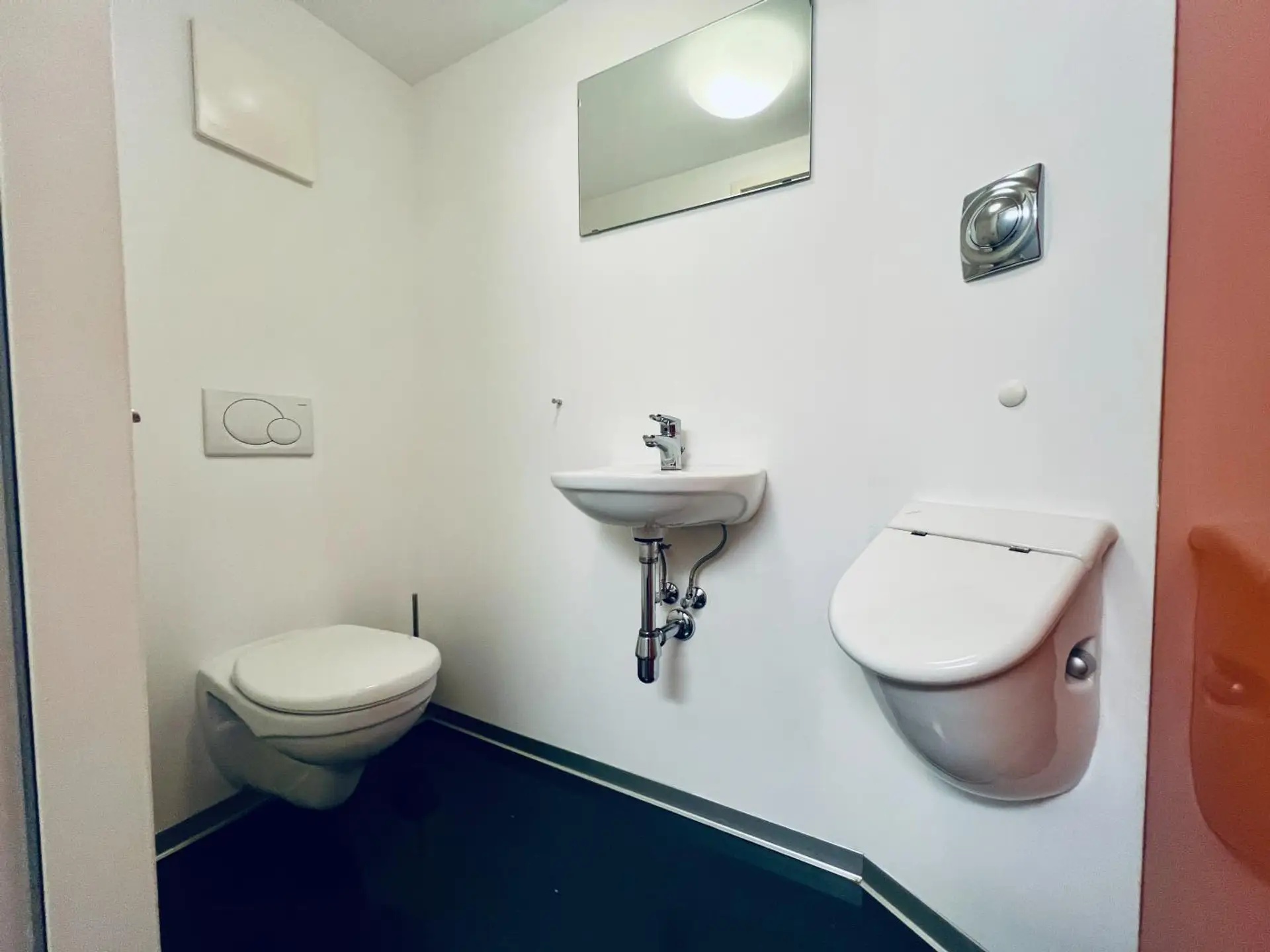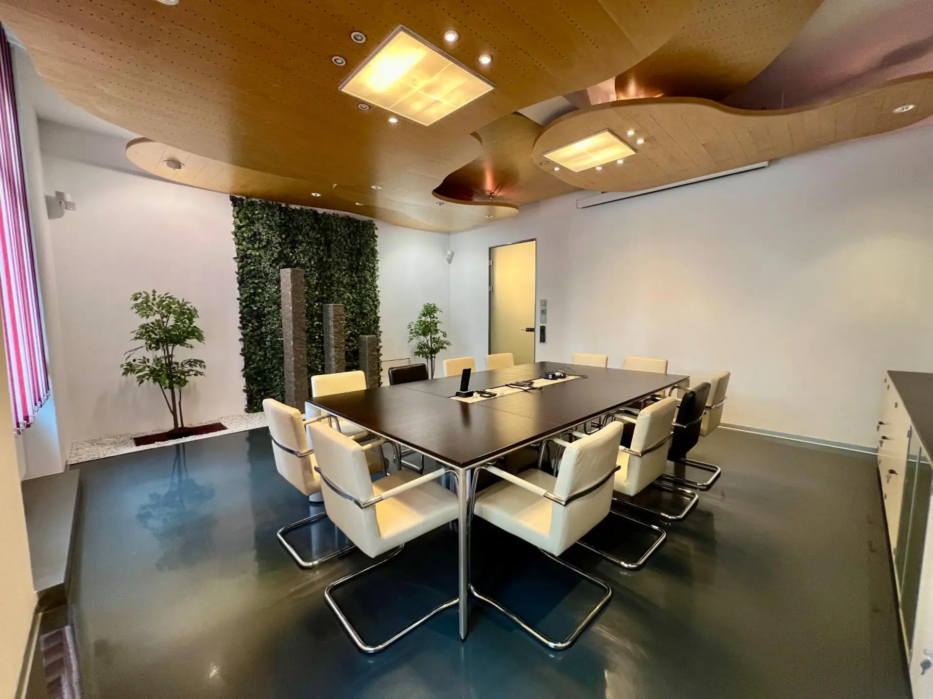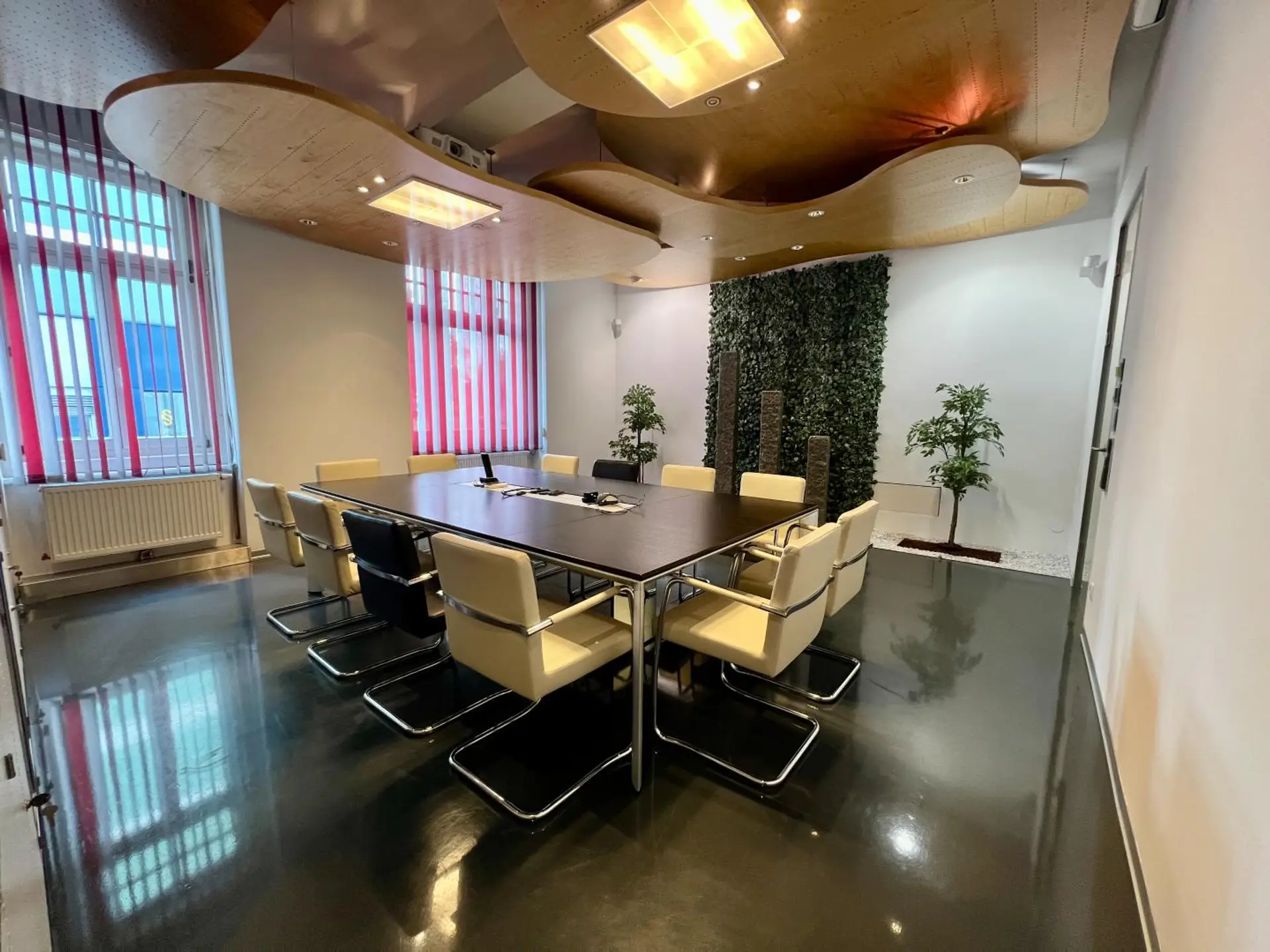 Die vorhandenen Räume – Empfangsbereich, zwei große Büros, Besprechungsraum, Teeküche, WCs, Dusche und Lager – können flexibel