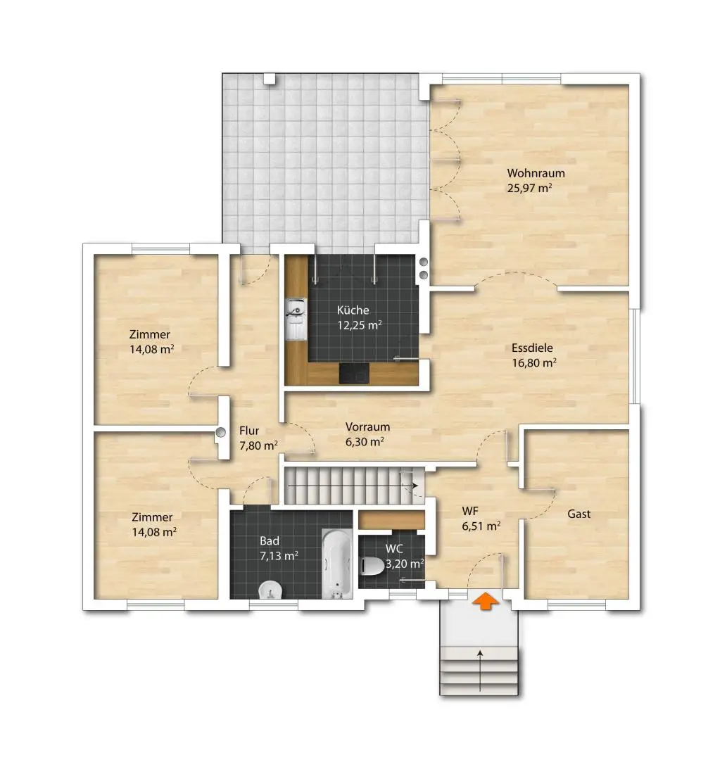 Das Highlight dieser Ebene ist, dass man von der Küche, dem Wohnzimmer auf die Terrasse gelangt.