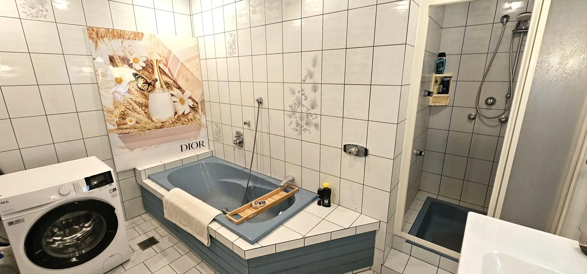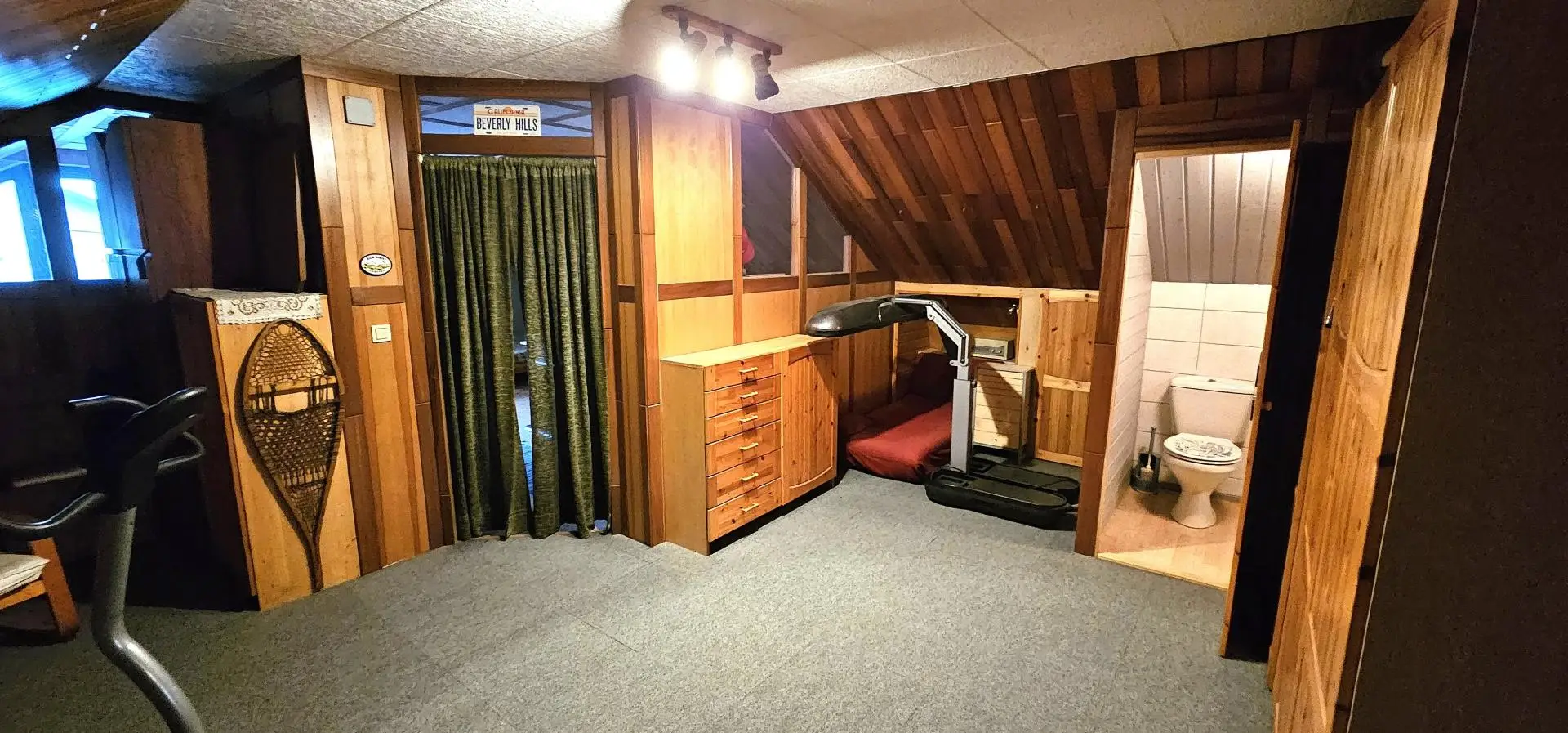 Der Wellnessbereich besteht aus Sauna (Ofen von 2024) mit Dusche&WC und Kinoecke.