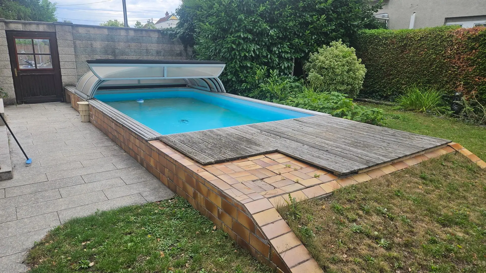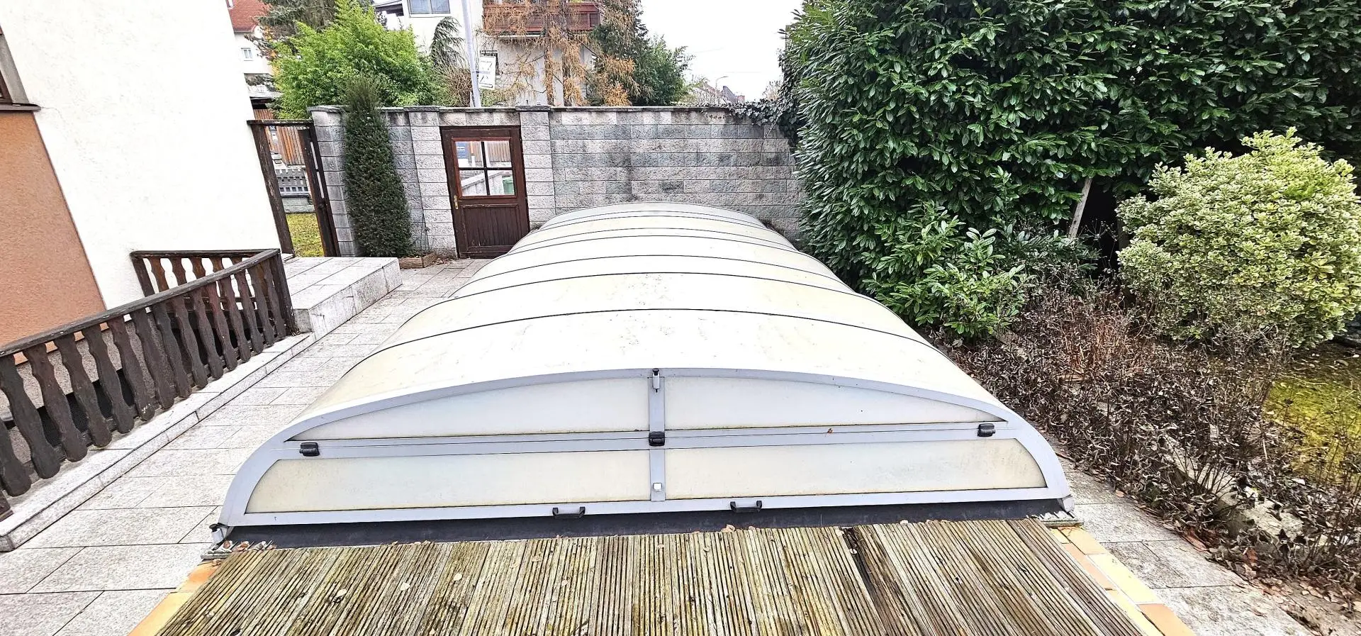 Der Pool besitzt eine einfahrbare Faltüberdachung.