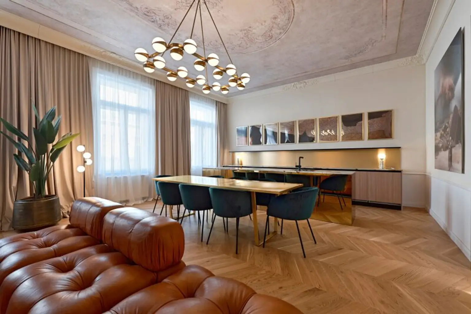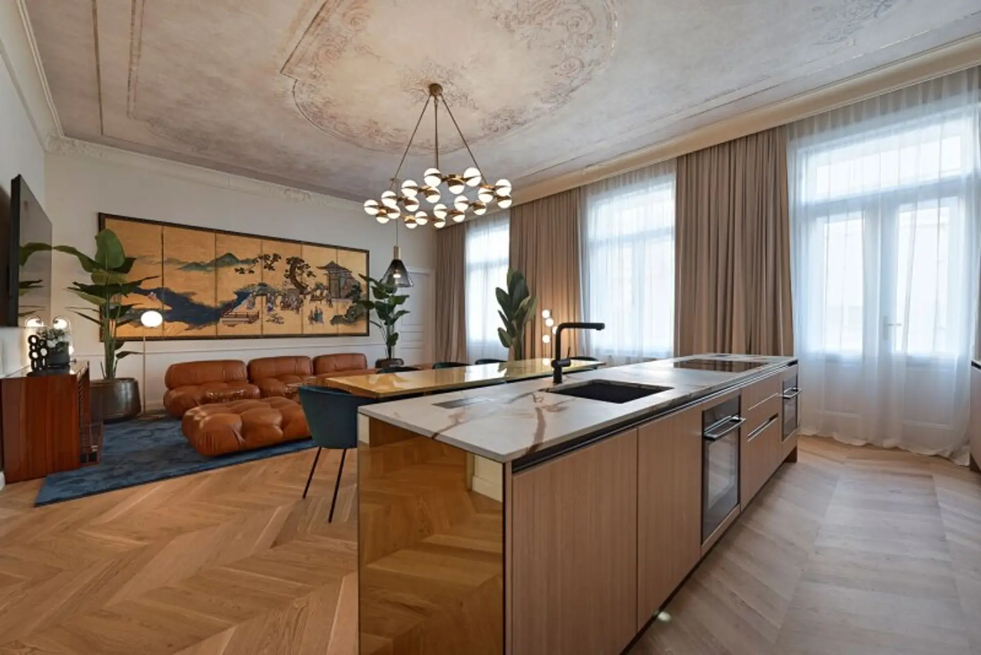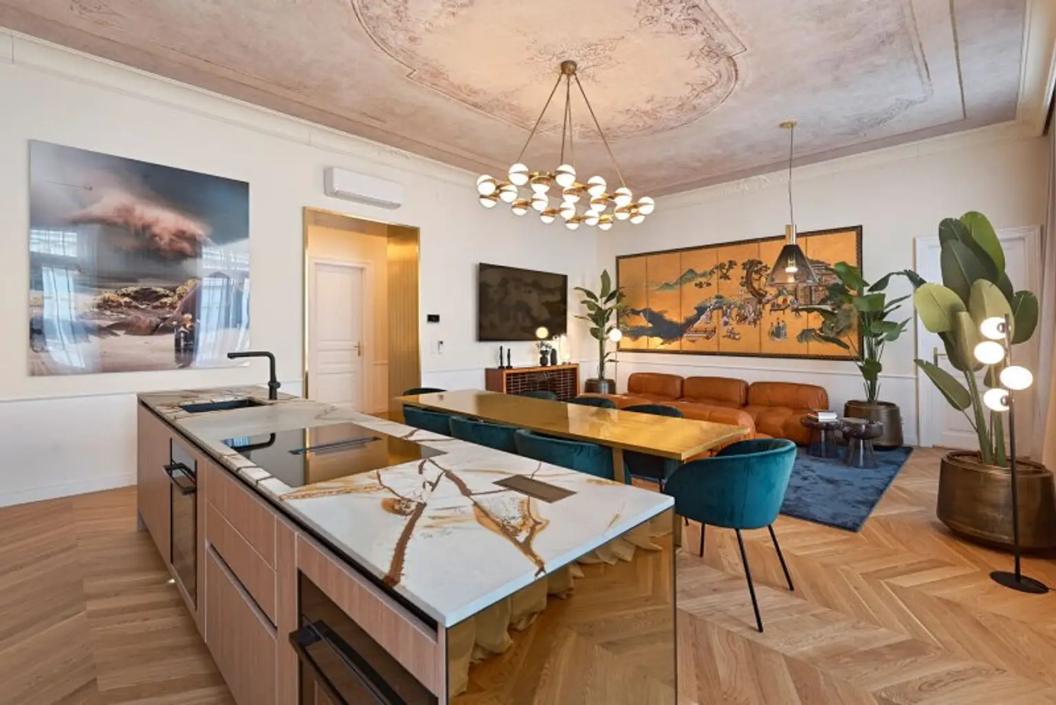 Der großzügige Wohnbereich ist geschmackvoll eingerichtet und mit kuratierten Kunstwerken ausgestattet. Er bietet viel Platz zum Entspannen, Verweilen und Zusammenkommen. Die moderne, voll ausgestattete Küche verfügt über hochwertige Geräte und ausreichend Arbeits- und Stauraum – ideal für gemeinsame Mahlzeiten mit Familie oder Gästen.