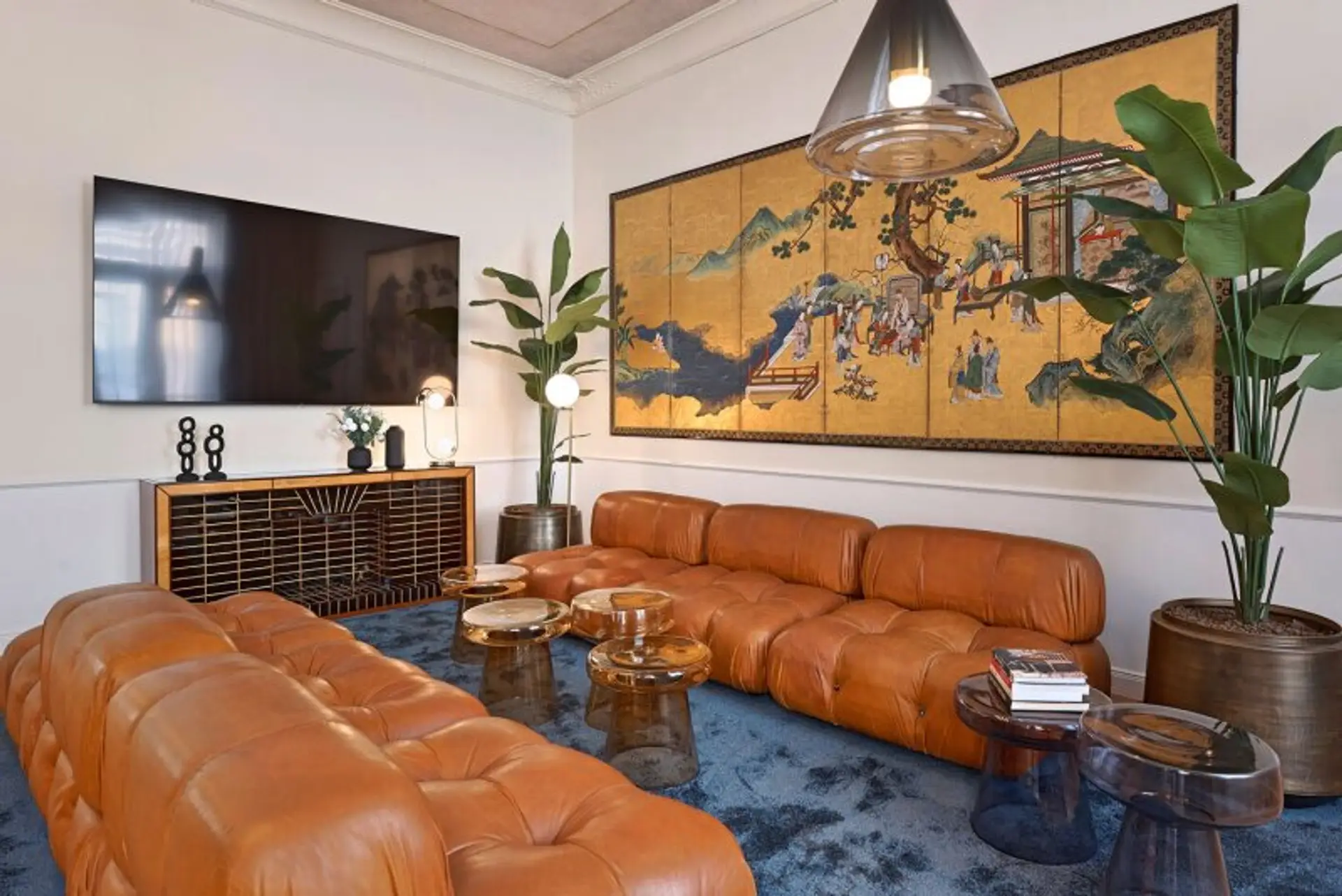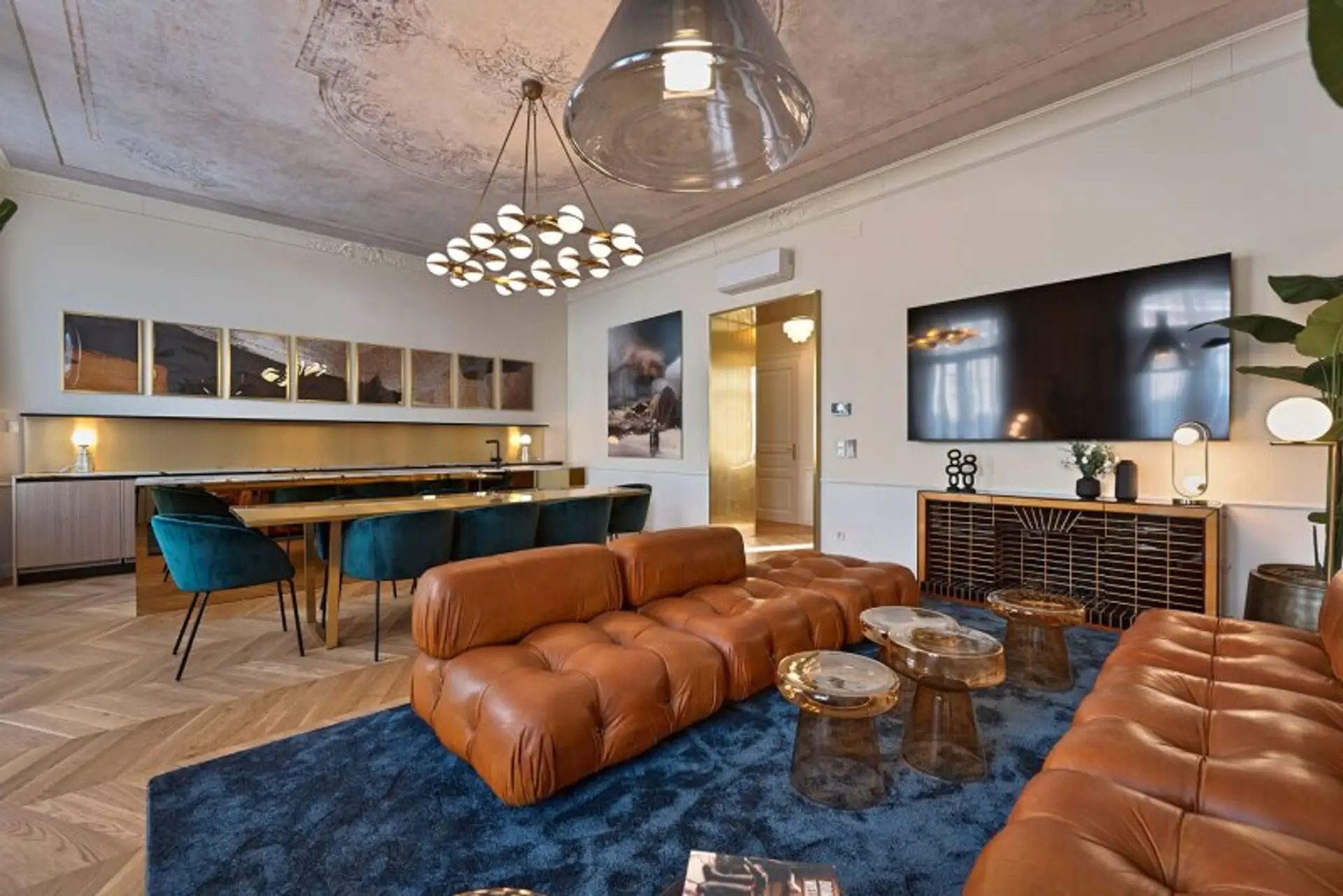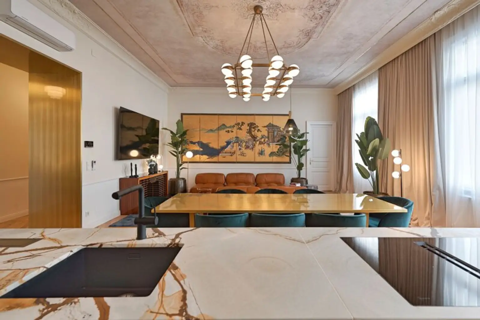 Der großzügige Wohnbereich ist geschmackvoll eingerichtet und mit kuratierten Kunstwerken ausgestattet. Er bietet viel Platz zum Entspannen, Verweilen und Zusammenkommen. Die moderne, voll ausgestattete Küche verfügt über hochwertige Geräte und ausreichend Arbeits- und Stauraum – ideal für gemeinsame Mahlzeiten mit Familie oder Gästen.
