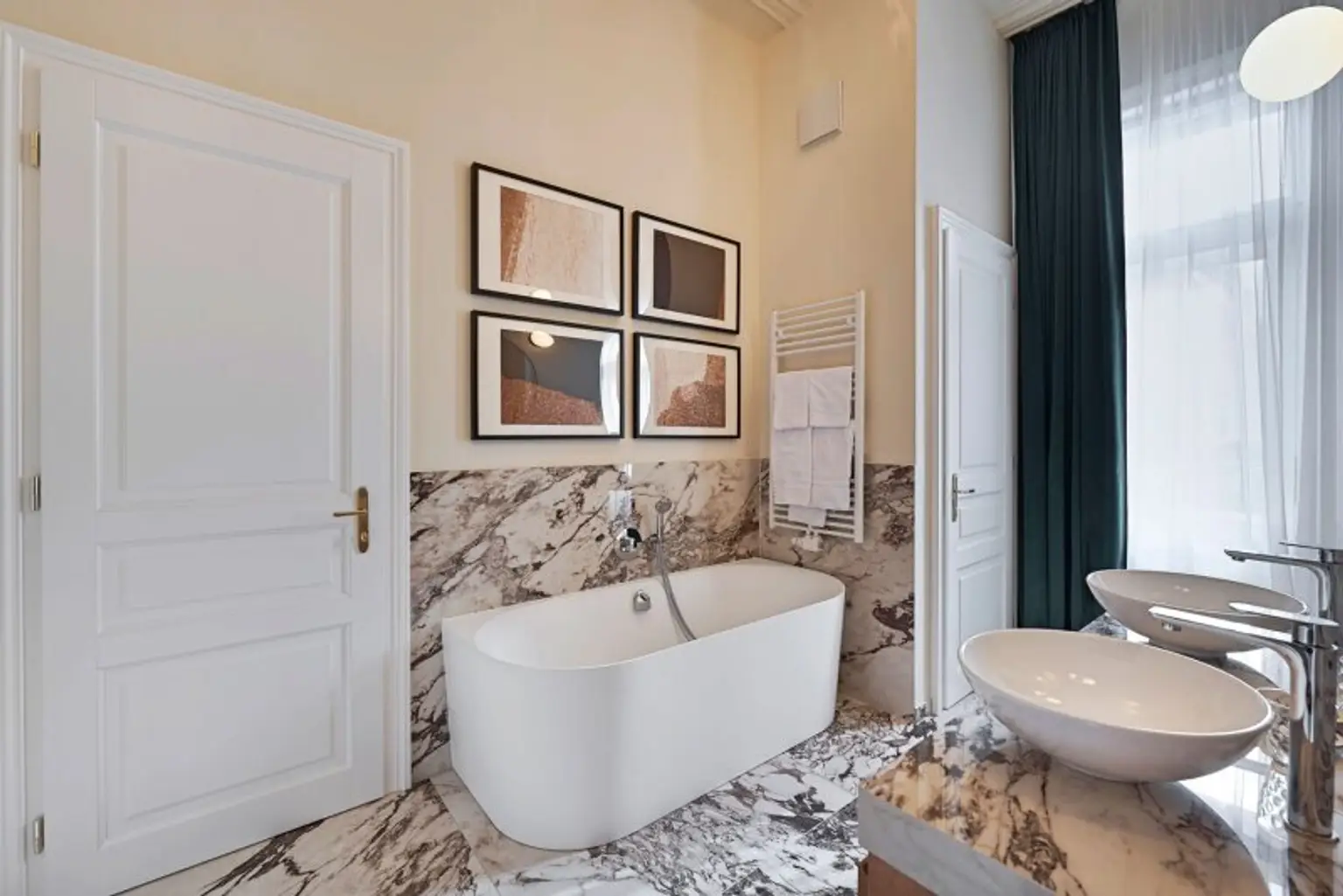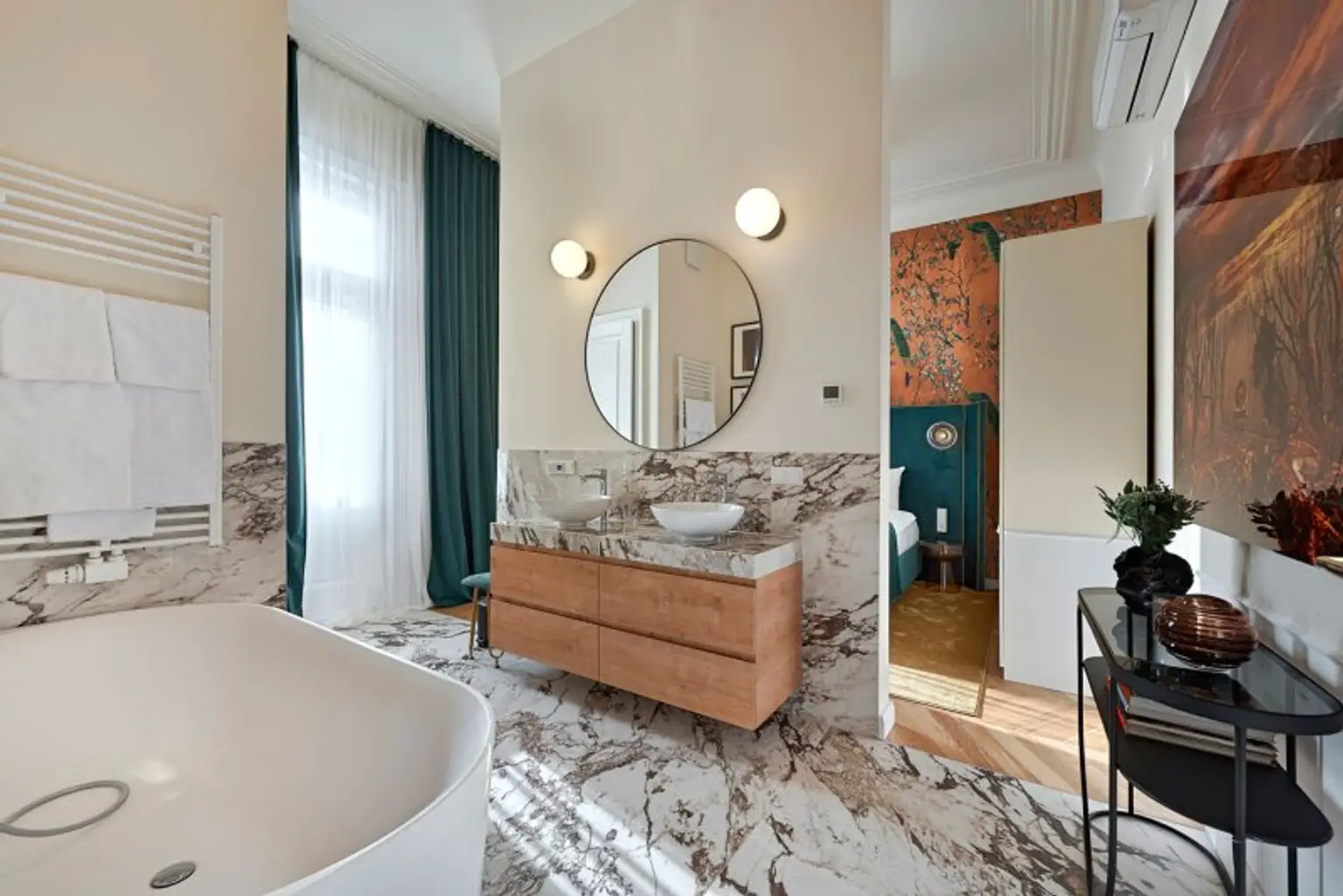 Dieses großzügige und hochwertig ausgestattete Apartment bietet ein außergewöhnliches Wohnerlebnis im diplomatischen Herzen Wiens. Auf rund 160 m² Wohnfläche verbindet die Wohnung modernes Design mit künstlerischer Eleganz und schafft eine stilvolle, zugleich warme Atmosphäre.