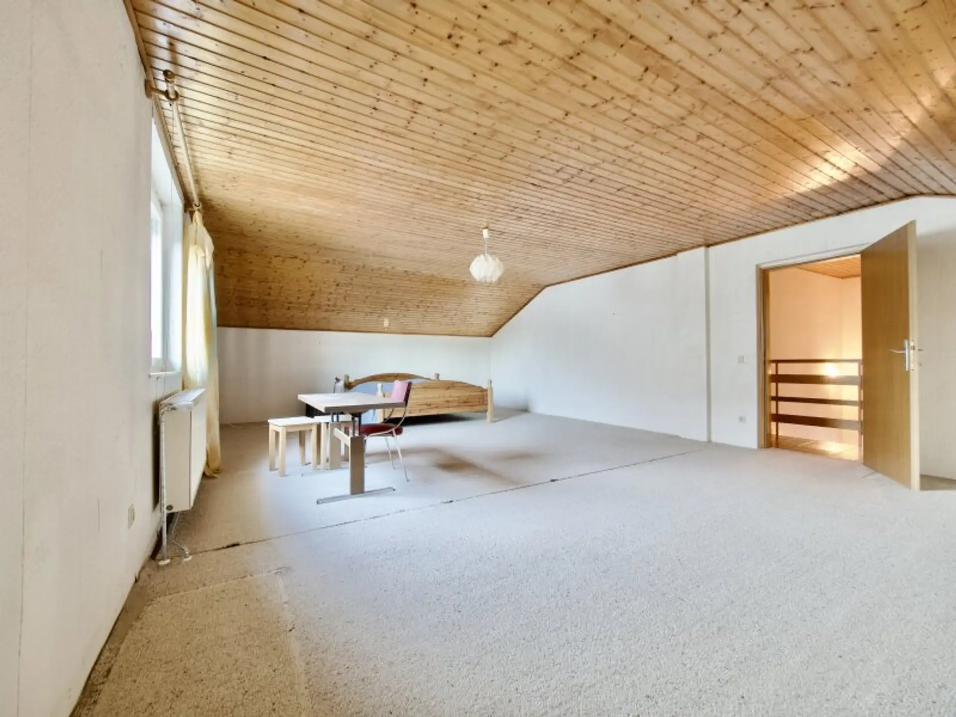 Über eine Treppe gelangt man vom Flur in das ausgebaute Dachgeschoss, auf dem sich ein ca. 54 m² großes Zimmer sowie zwei weitere kleinere Räume und darüber hinaus noch ausreichend Stauraum befinden. Das Dachgeschoss bietet durch seine Größe ideale Voraussetzungen für eine zeitgemäße Adaptierung und dem Einbau eines weiteren Badezimmers.