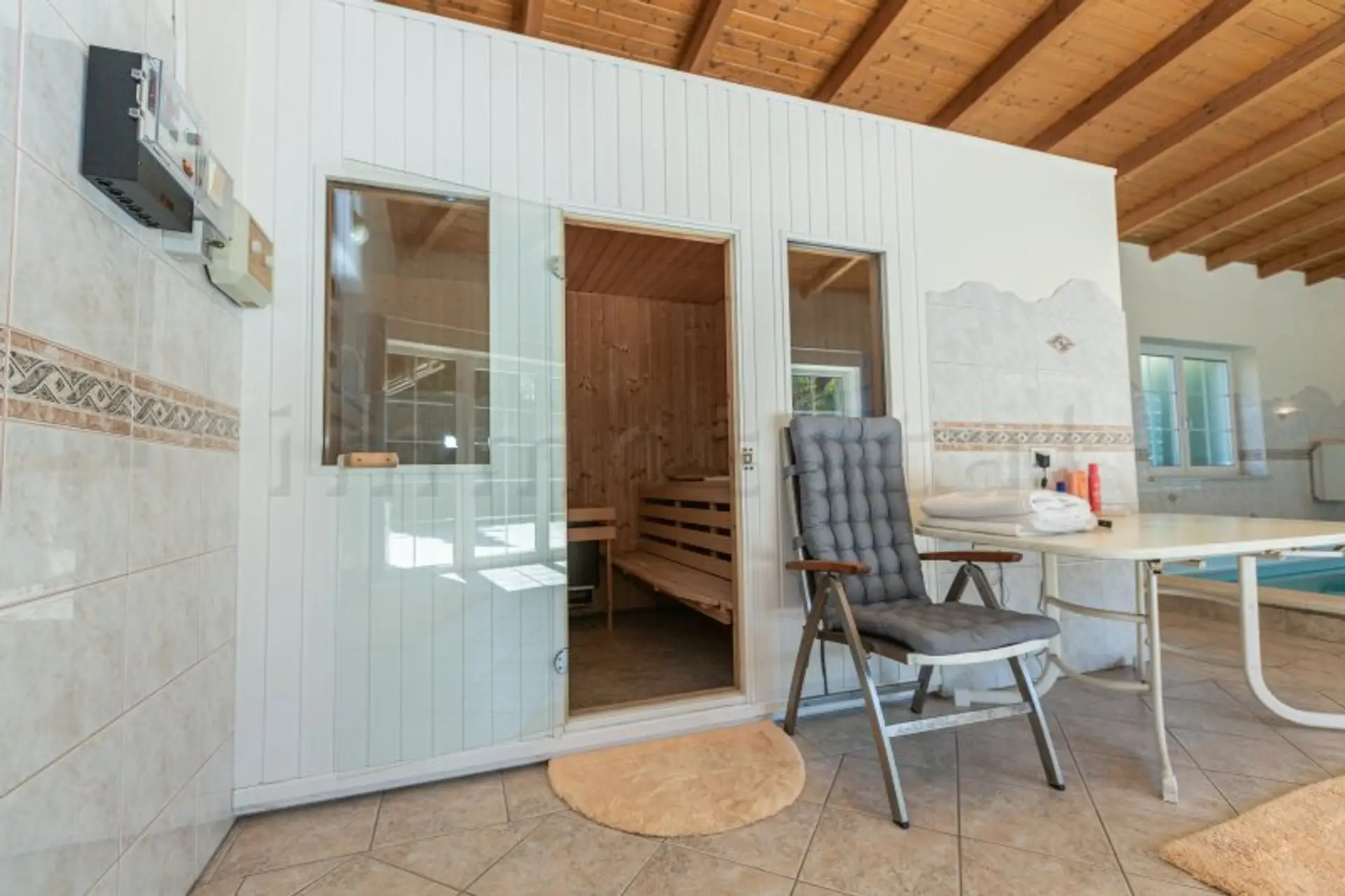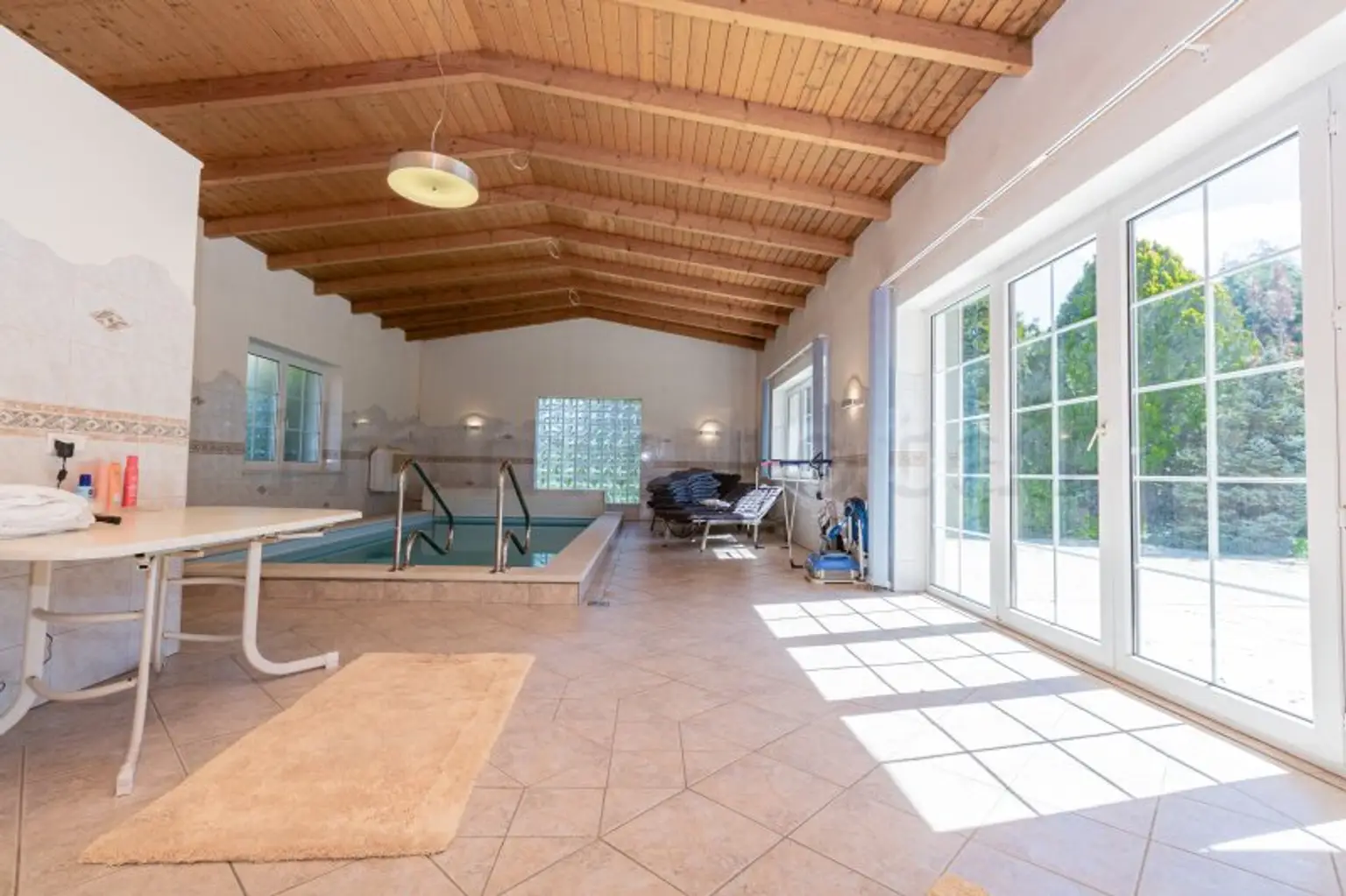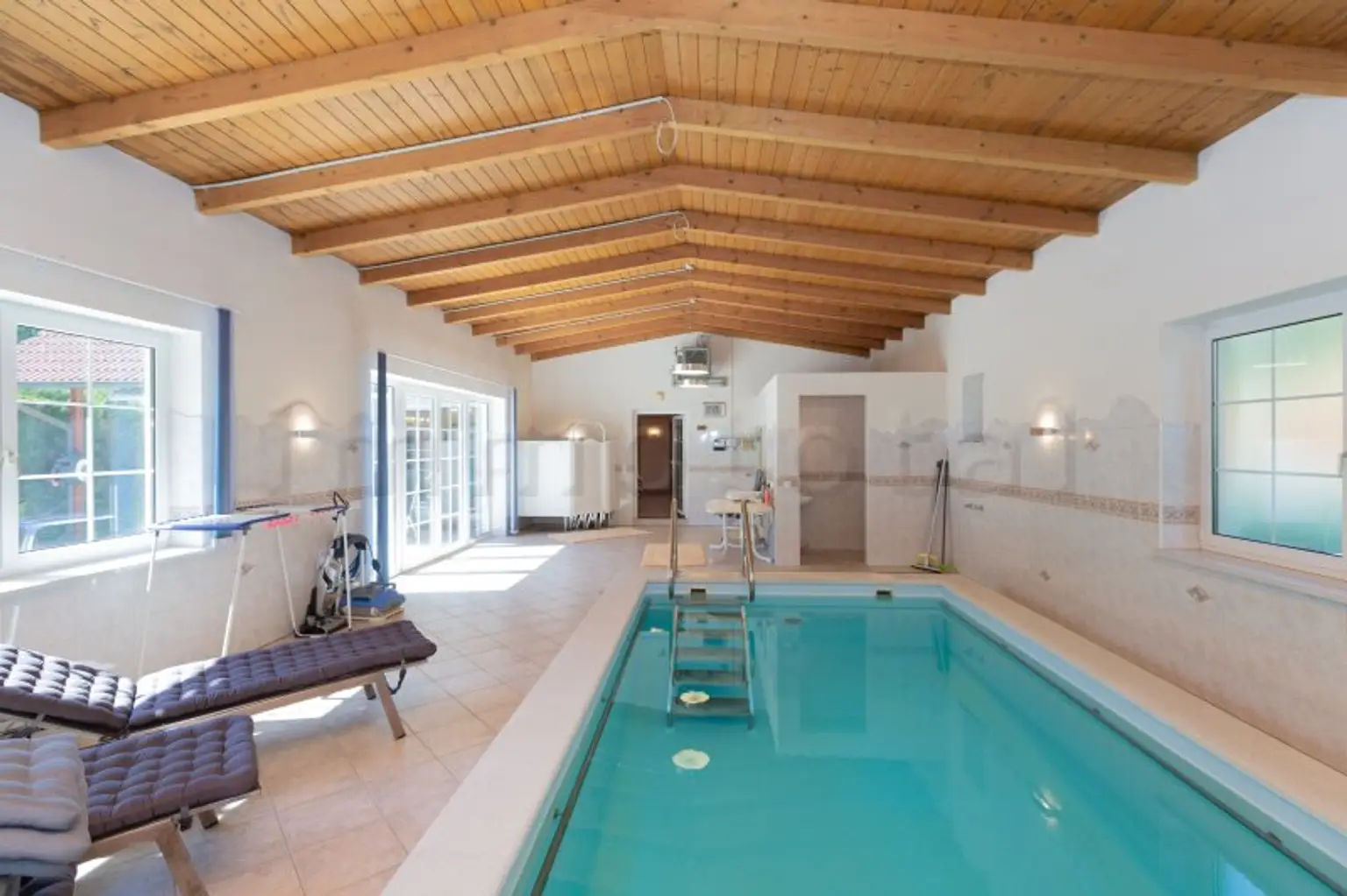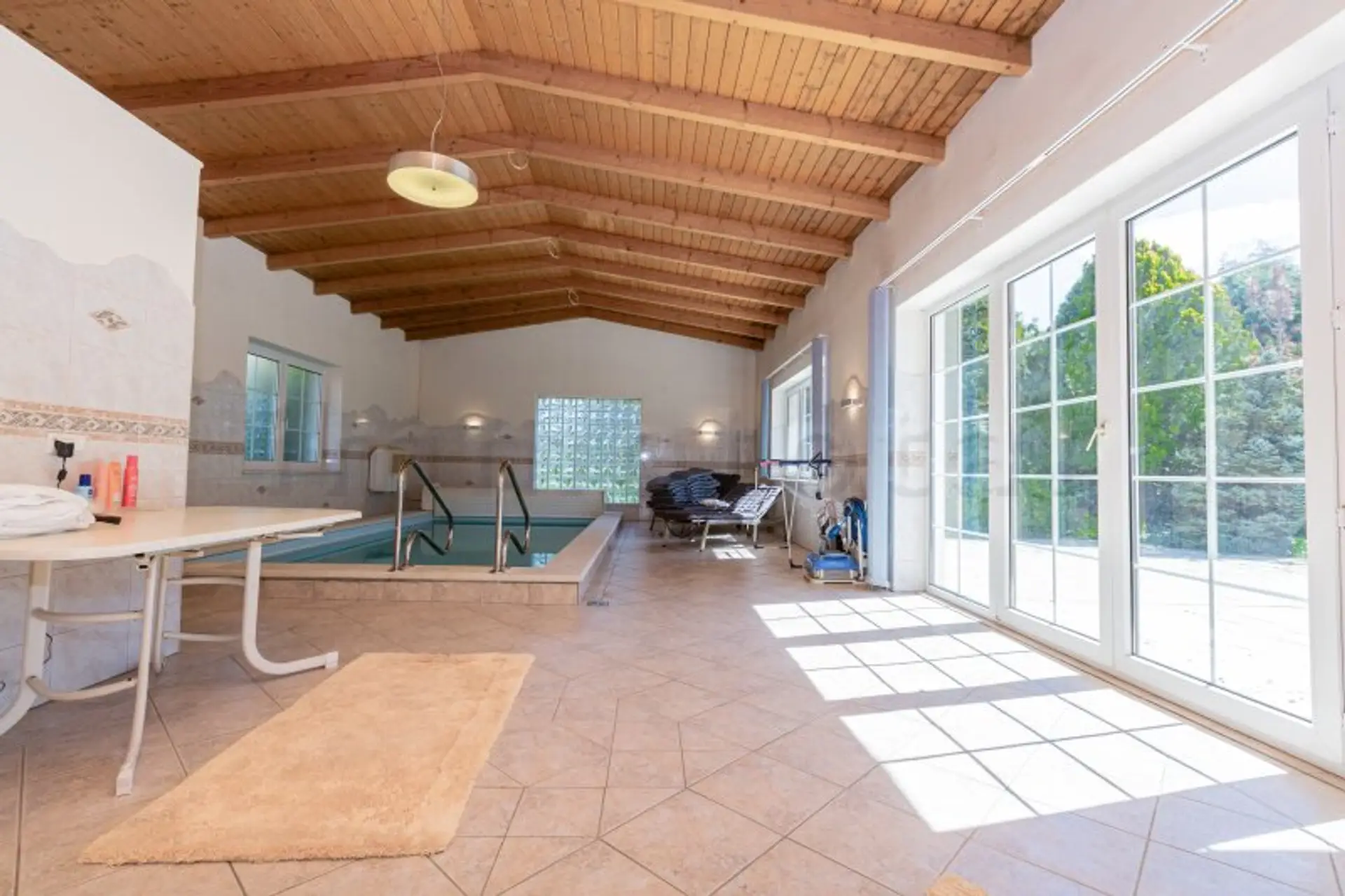 Das zentrale Highlight der Liegenschaft bildet die im Haus integrierte Schwimmhalle mit angeschlossenem Wellnessbereich. Eine großzügige Doppelflügeltüre schafft hier eine unmittelbare Verbindung zur weitläufigen uneinsehbaren Gartenterrasse. Diese besondere Konzeption ermöglicht es, die Vorteile eines Indoorpools mit dem Gefühl eines Outdoorpools zu verbinden, da sich das Becken nur wenige Meter von der Terrasse entfernt befindet und der Wohnraum auf sehr stimmige Weise nach außen erweitert wird.