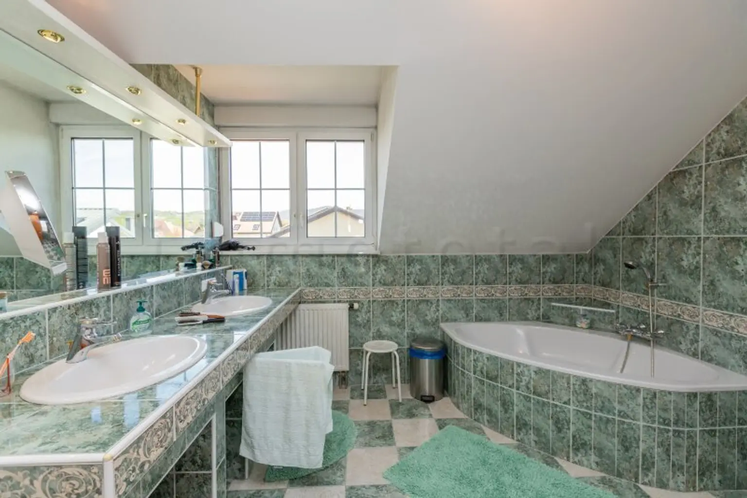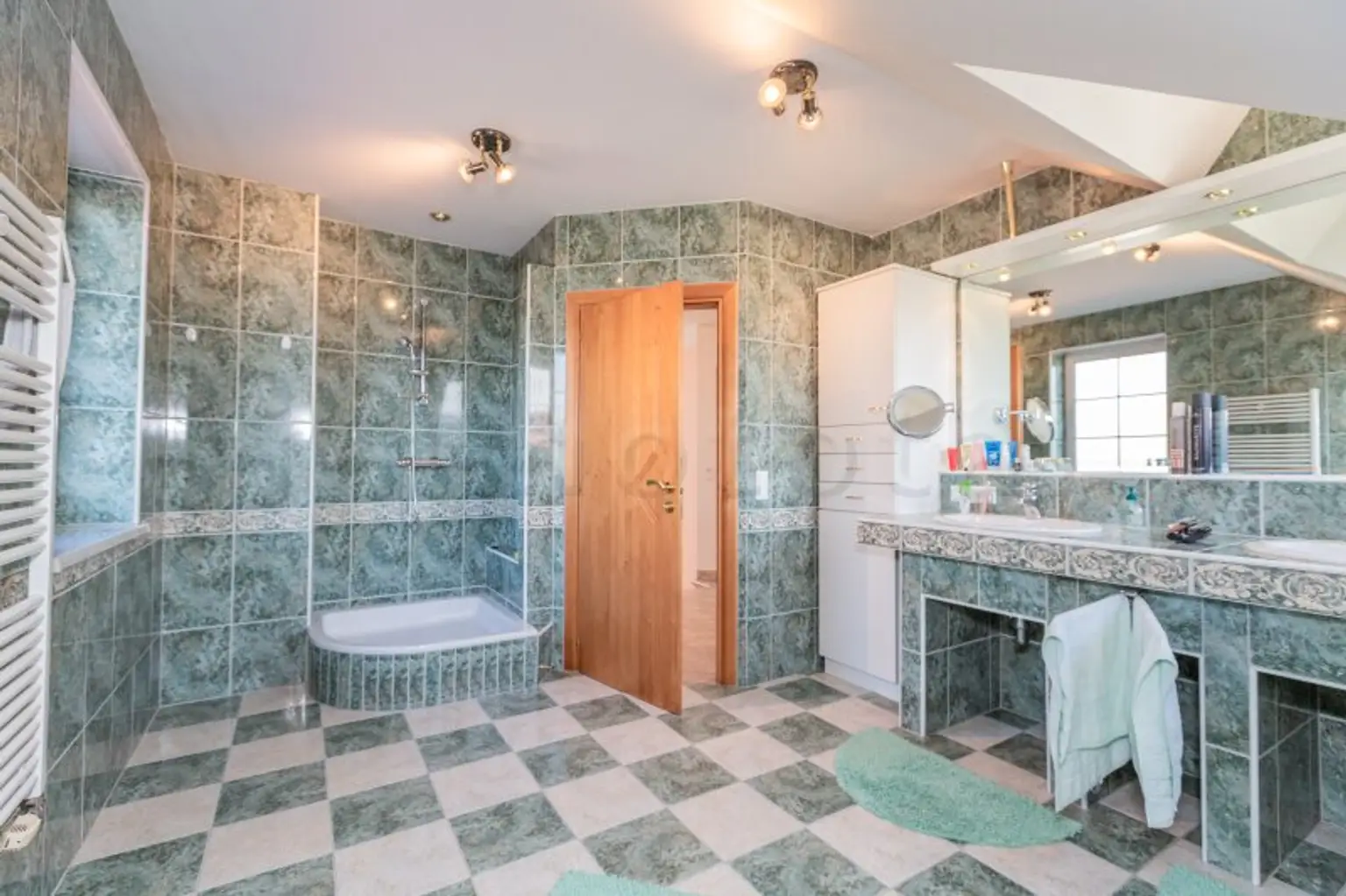* Badezimmer mit Eckbadewanne, Doppelwaschtisch und Dusche