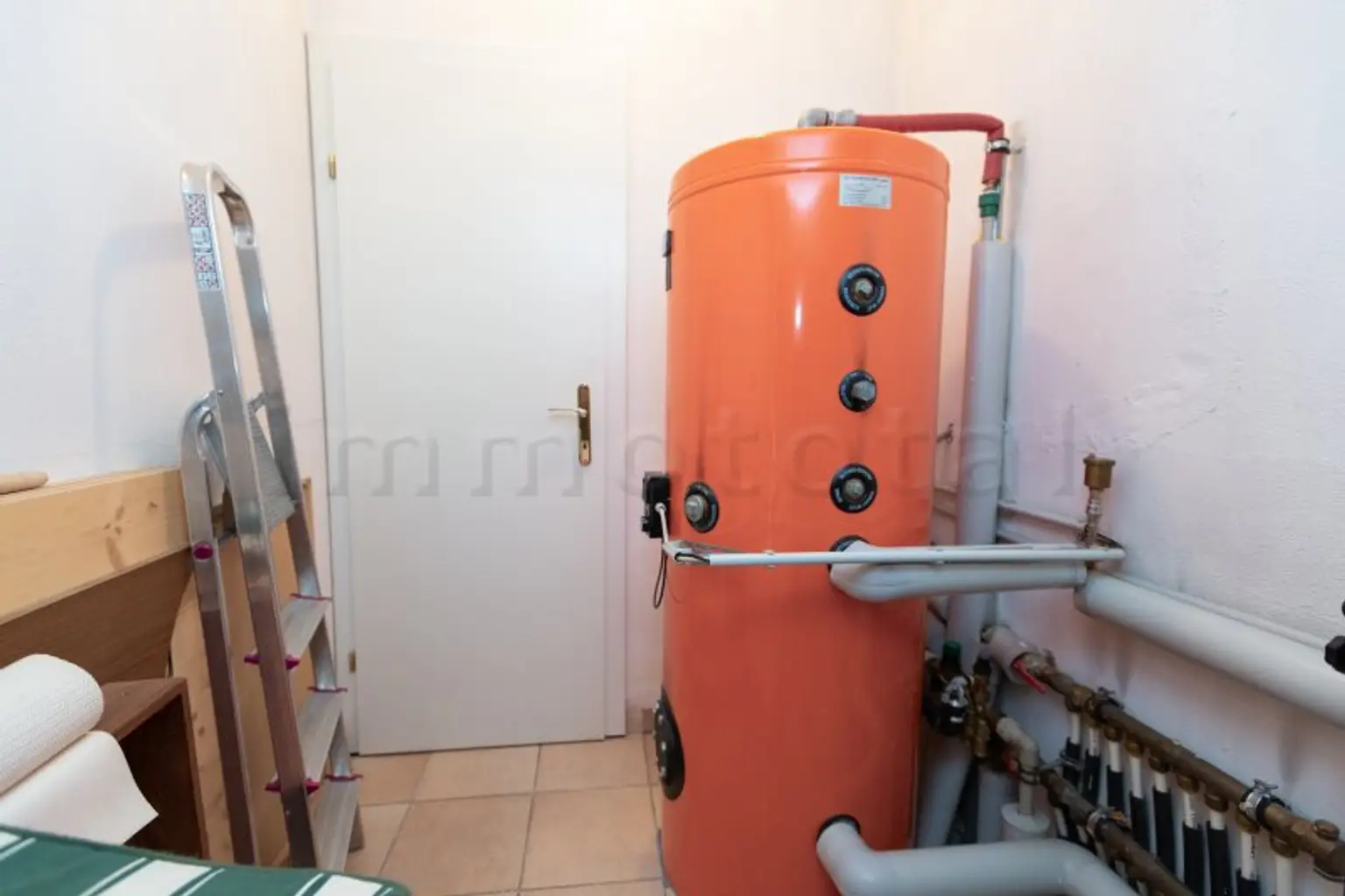 Gas-Etagenheizung mit vier Kreisläufen (1. Hausheizung mit Radiatoren, 2. Warmwasser, 3. Luftheizung Poolhalle, 4. Heizung Poolwasser), Offener Kamin im Erdgeschoss