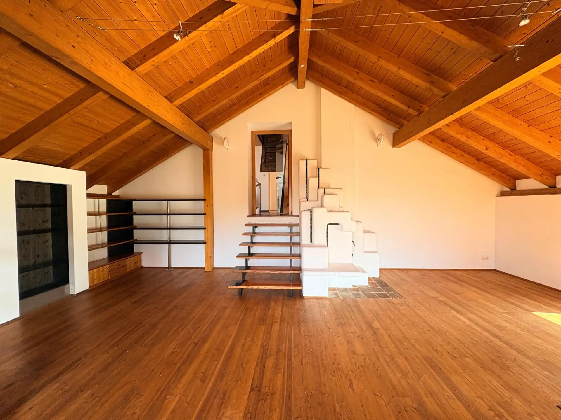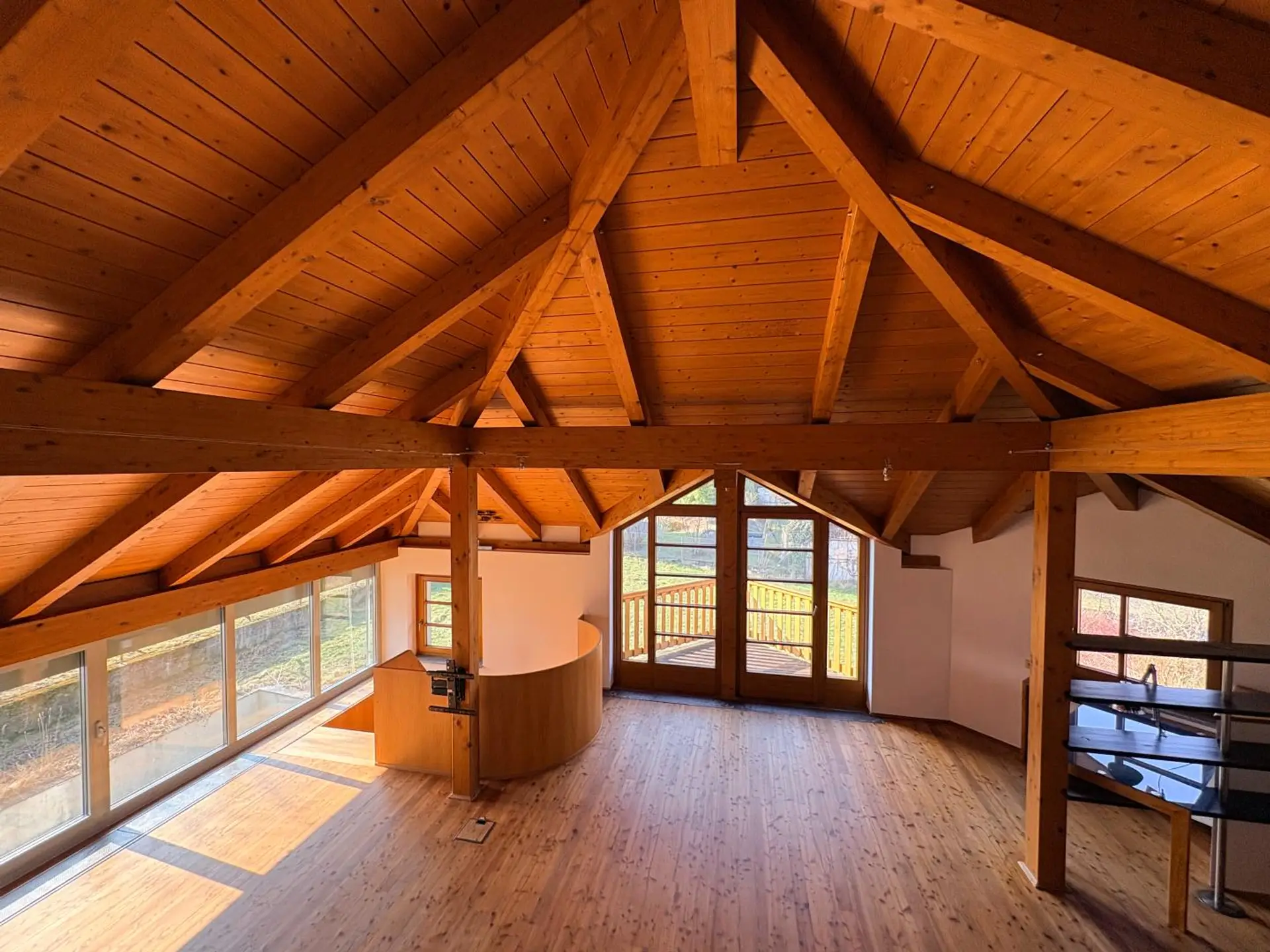 Im Obergeschoss befinden sich die weiteren Räumlichkeiten des Hauses welche vielseitig genutzt werden können. Ein absolutes Highlight ist der nach oben offene, beeindruckende Wohnraum im Obergeschoss, der mit seiner Großzügigkeit und Raumhöhe ein einzigartiges Wohnambiente schafft. Der integrierte Kamin sorgt für behagliche Wärme, während der direkte Zugang zum Balkon einen wunderbaren Ausblick in den Garten bietet.