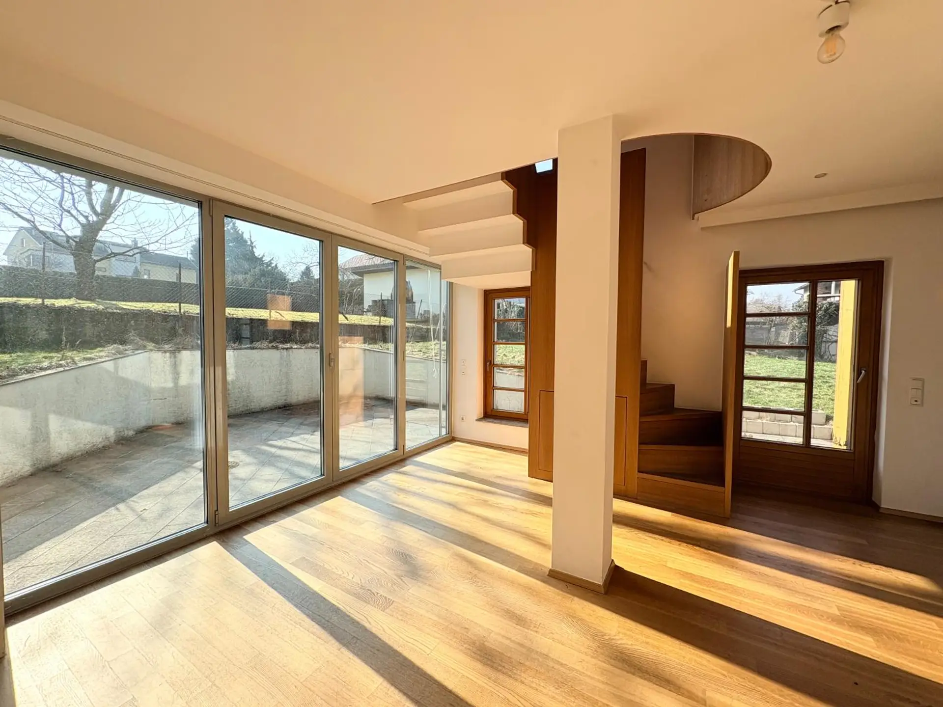 Im Erdgeschoss befinden sich neben dem Eingangsbereich inkl. Vorraum der offene Wohn/Essbereich inkl. Küche samt Wintergarten mit Ausgang in den Garten, eine Wendeltreppe ins Obergeschoss, das Badezimmer, WC, Schlafzimmer und das Gästezimmer/Büro. Der offene Wohn/Essbereich mit den großzügigen Fensterflächen sind besonders positiv zu erwähnen.