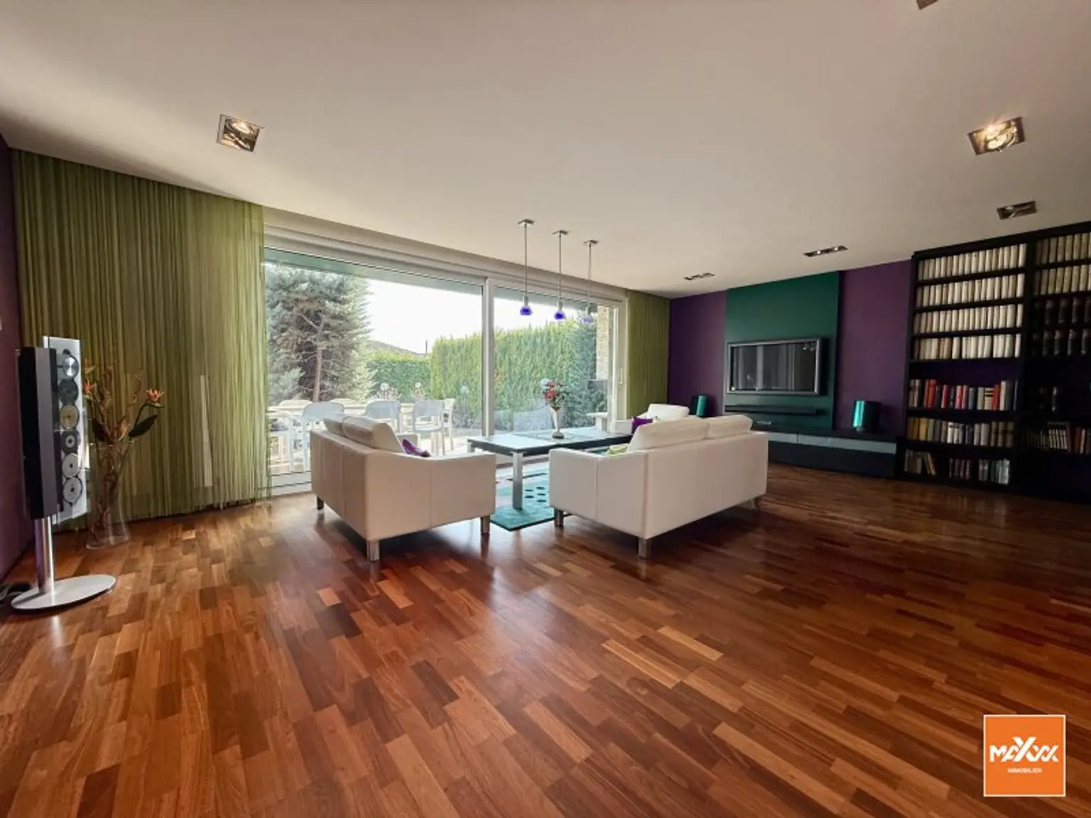 ein außergewöhnlich großes Wohnzimmer, ausgestattet mit hochwertigem Parkettboden, der für eine warme, gemütliche Atmosphäre sorgt