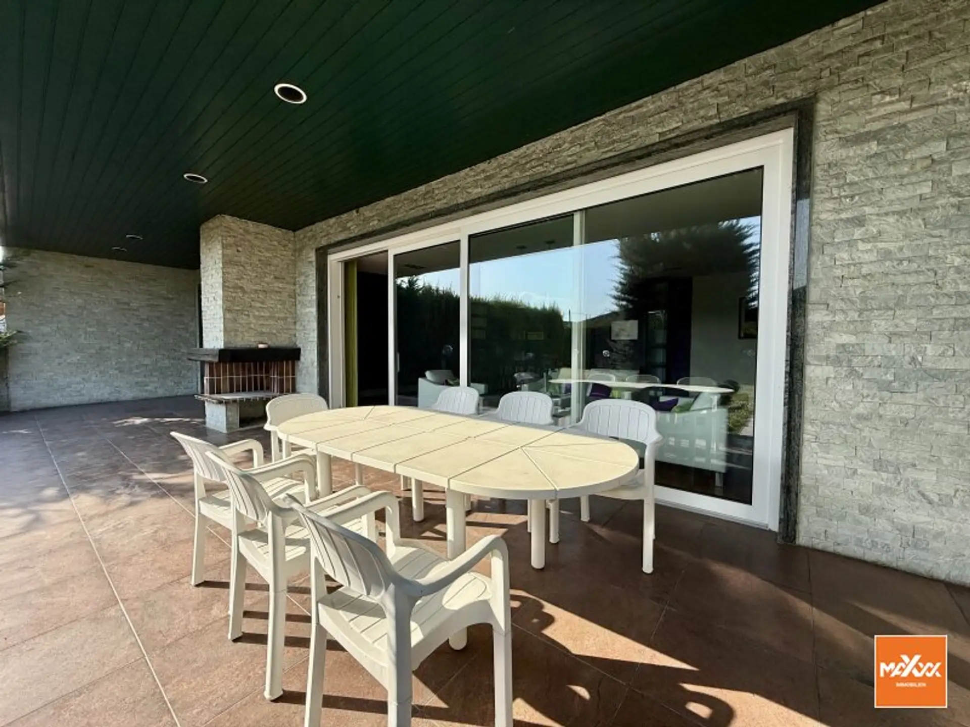 Die große, überdachte Terrasse mit offenem Kamin lädt ganzjährig zu entspannten Stunden ein – perfekt für gemütliche Abende im Freien.