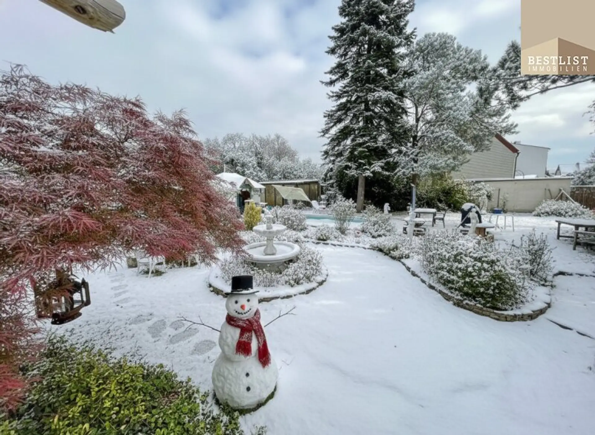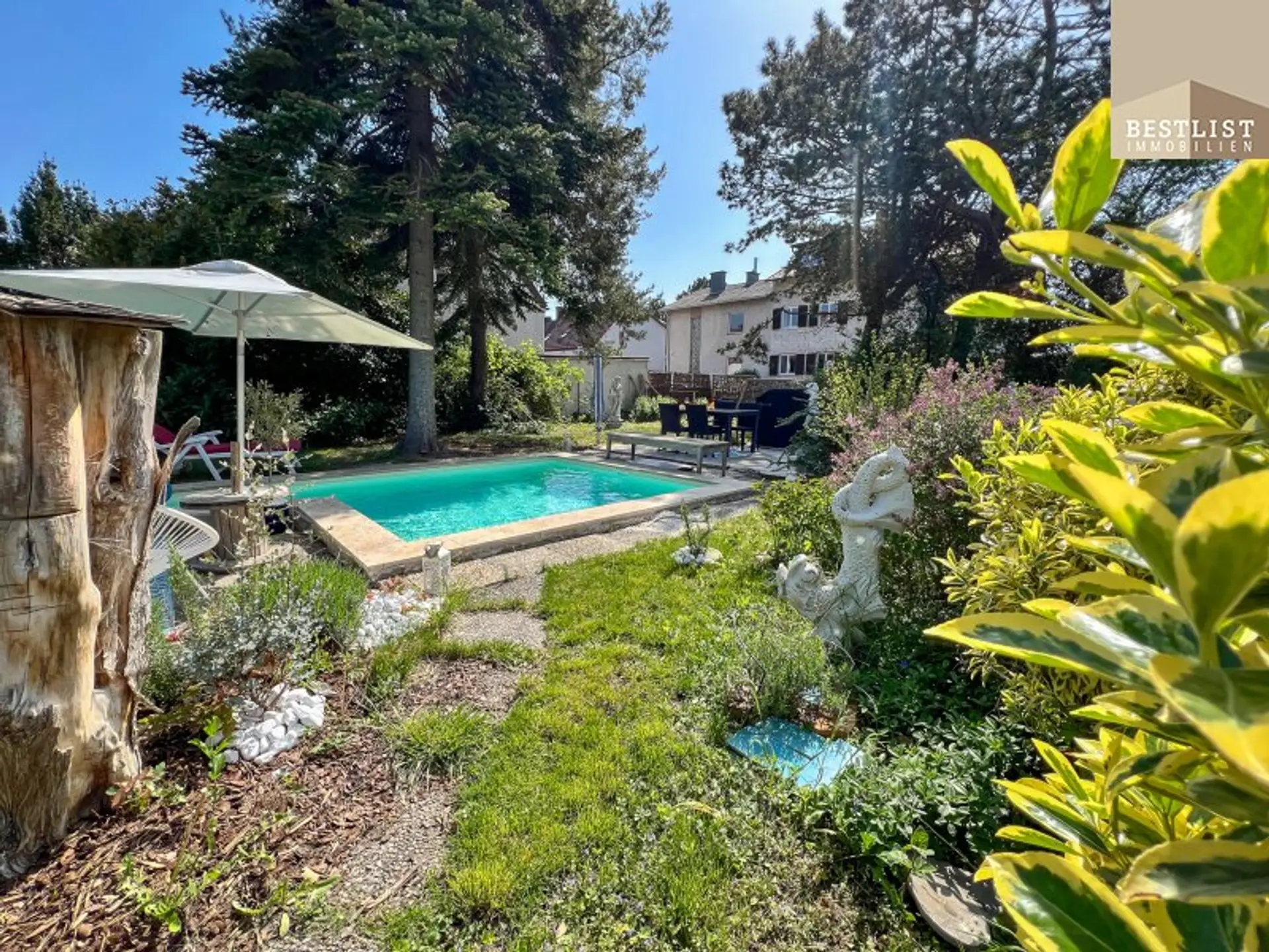 Der großzügige Garten ist ein echtes Highlight: Ein gemauerter Pool sorgt an heißen Tagen für Erfrischung, die Gartenanlage lädt zum Entspannen, Spielen oder Gärtnern ein.