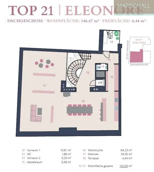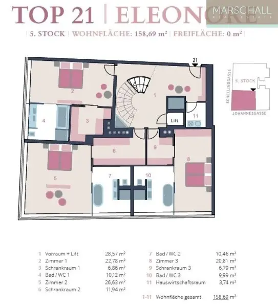 Das Apartment erstreckt sich über zwei Ebenen mit jeweiligen separaten Eingängen mit darüberliegenden Terrassen, welche alle mit dem Lift erreichbar sind.