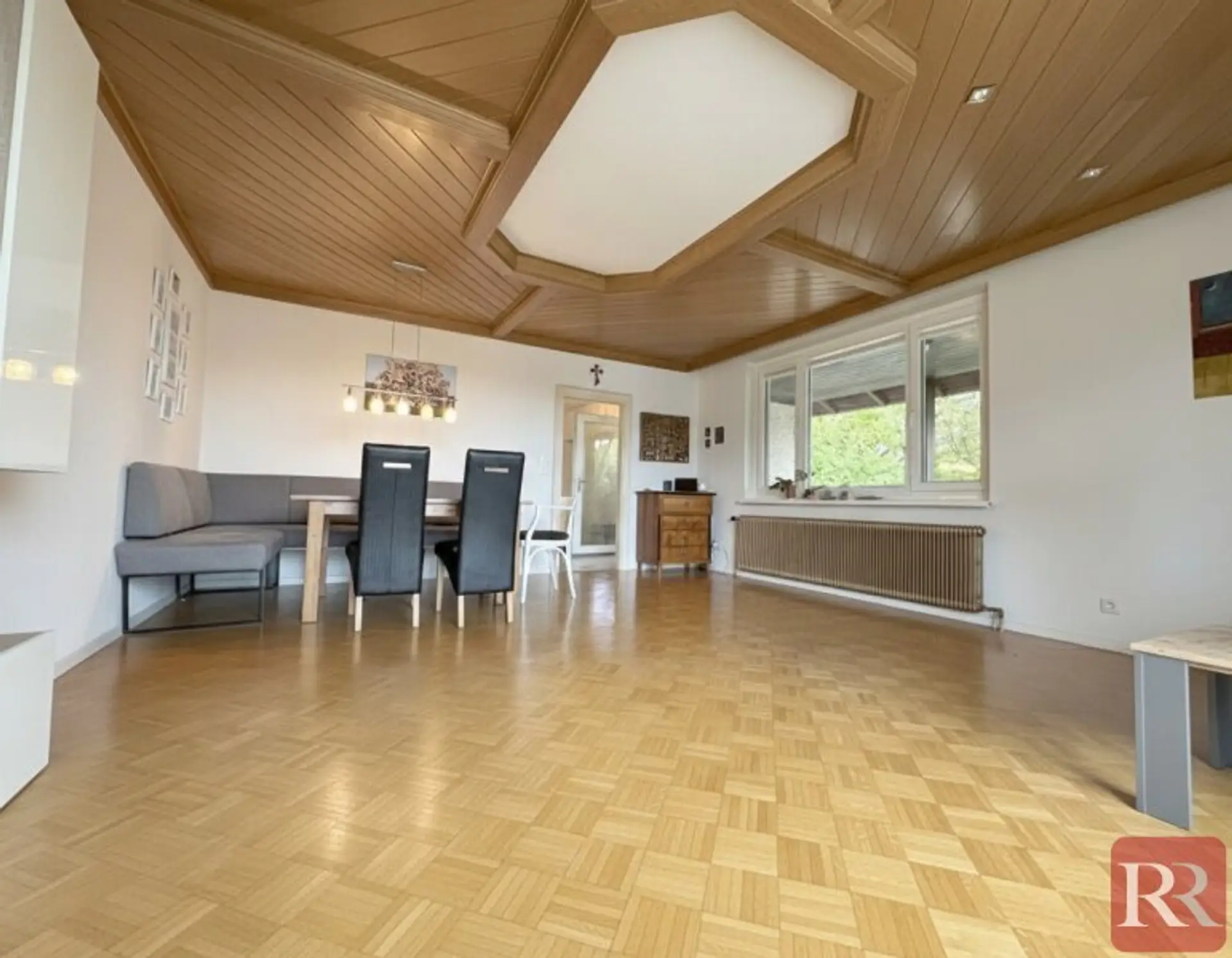 Heller Wohn- und Essbereich mit großen Fensterflächen