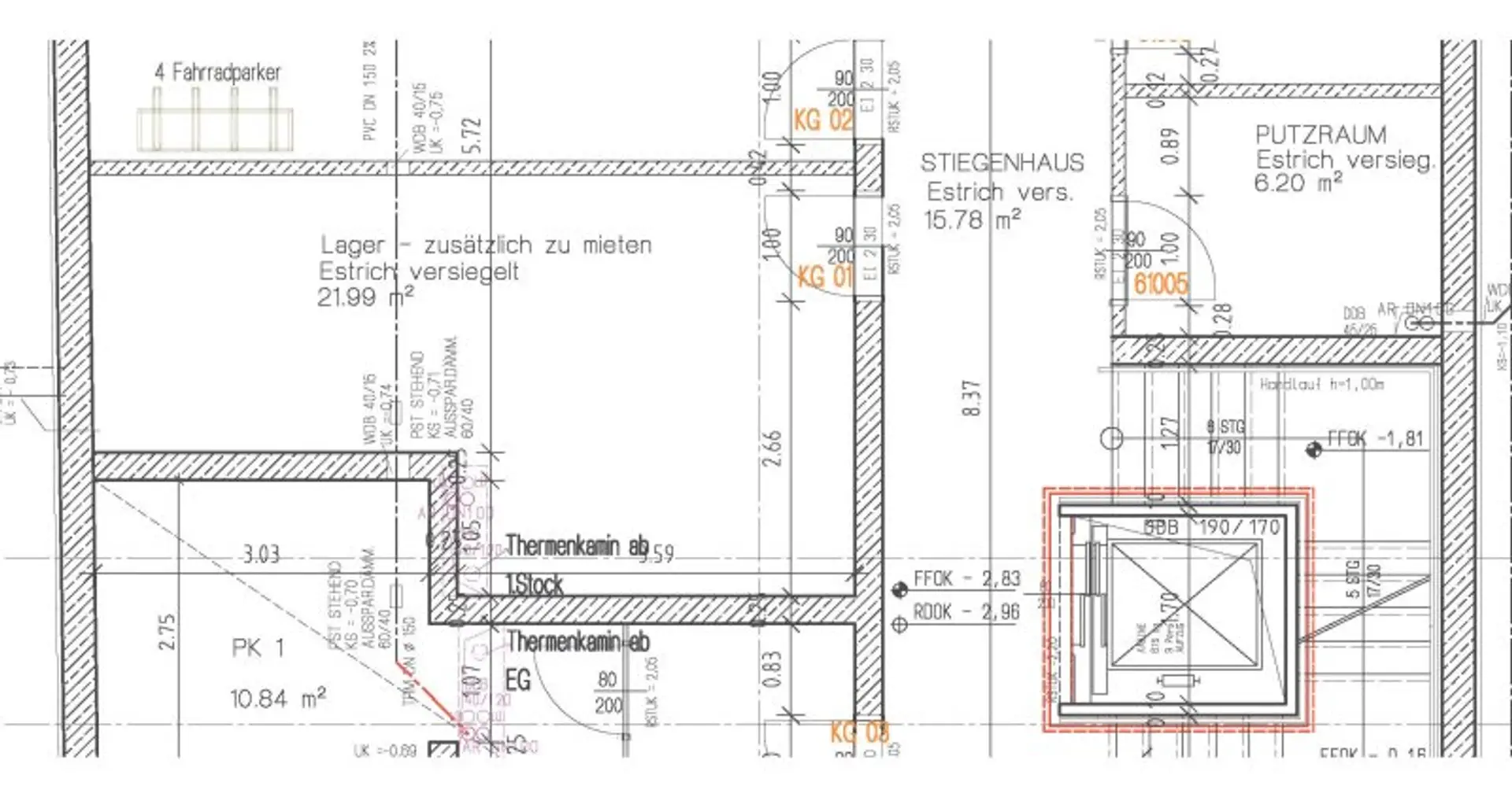 Der große und trockene Lagerraum befindet sich im Untergeschoss, der mit dem Lift und barrierefreiem Zugang erreichbar ist und mit einer Lüftung, Licht und Betonboden ausgestattet ist.