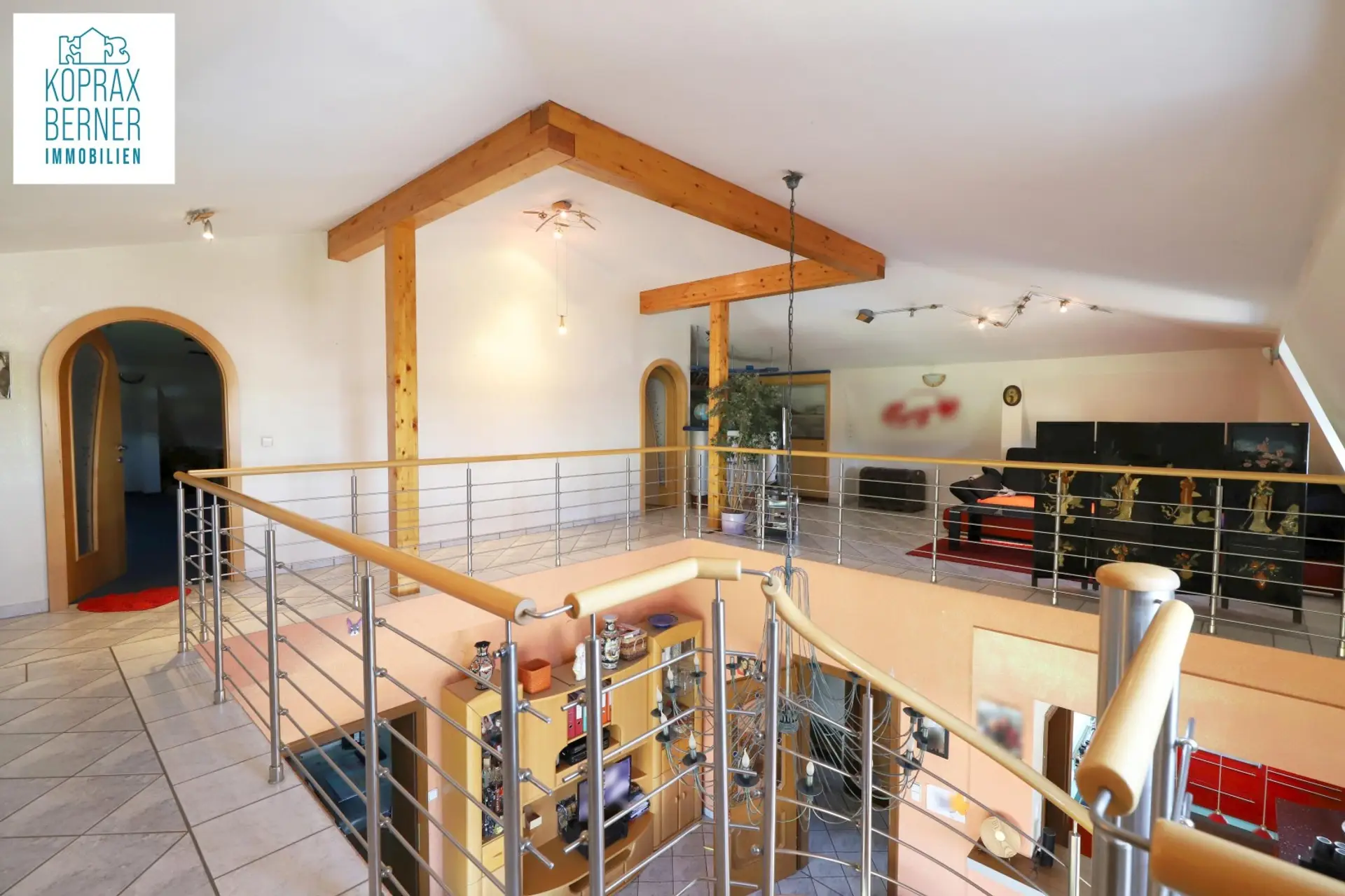 > Galerie mit kleiner Bar-Ecke und Fernsehcouch