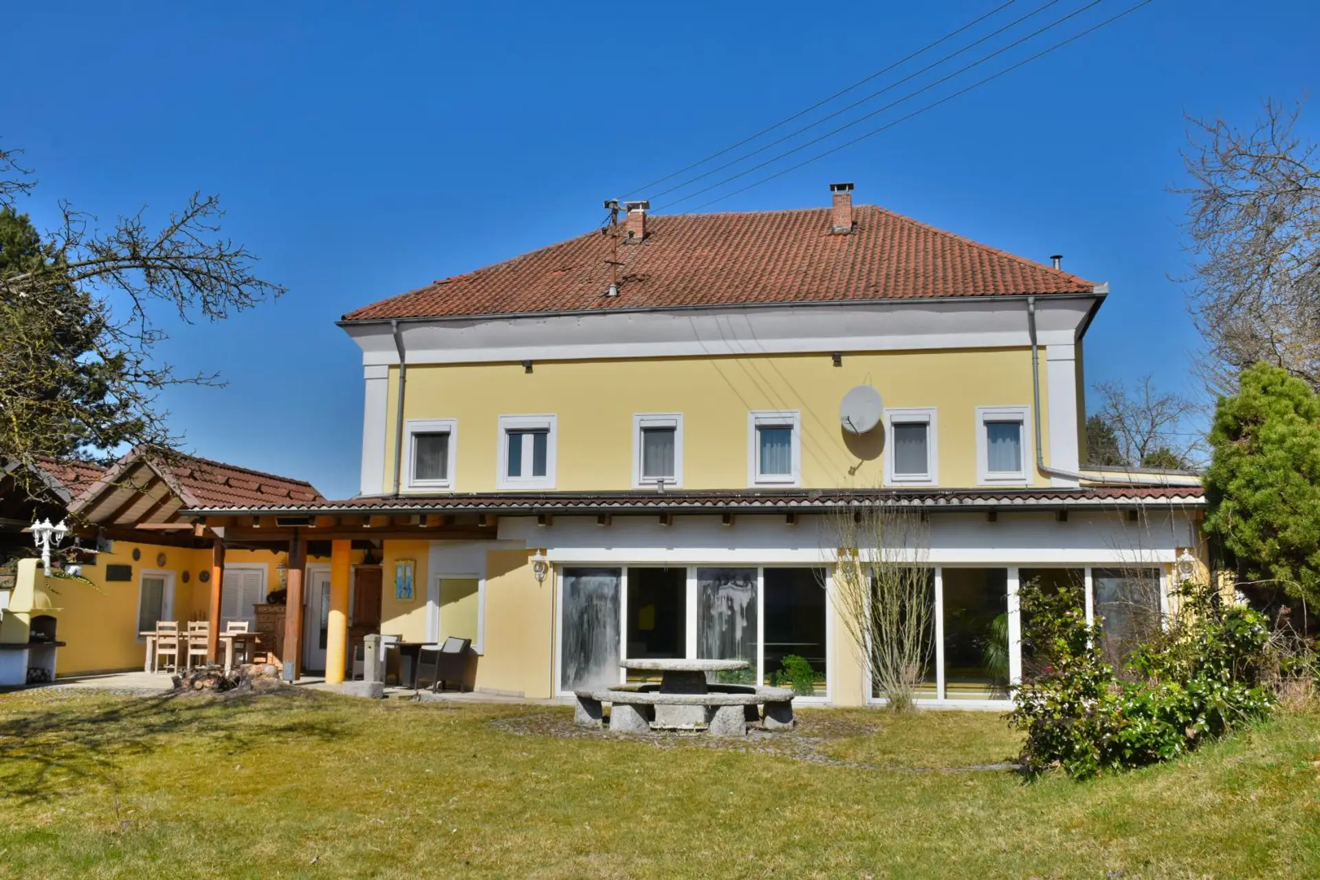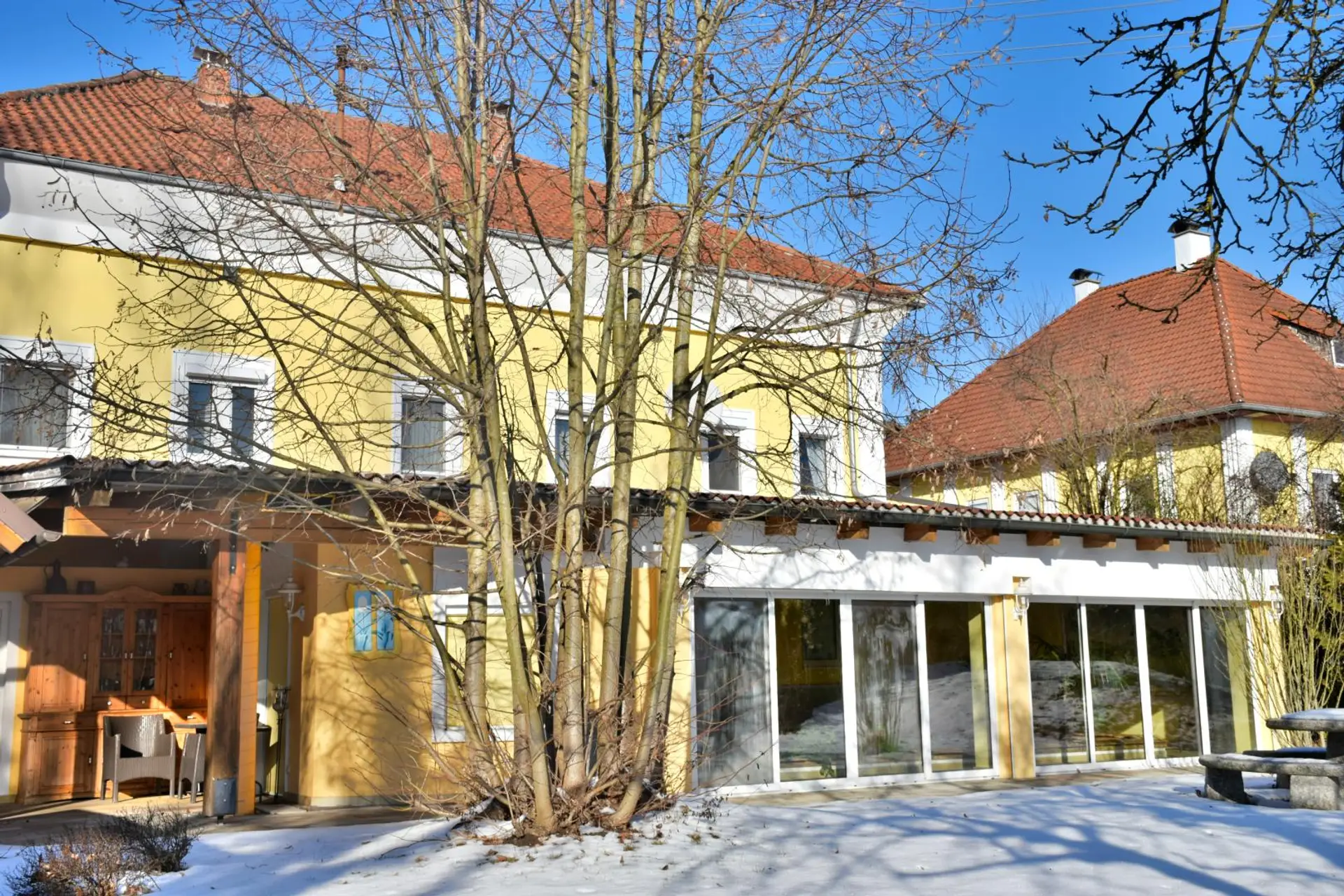 Als Highlight dieser Immobilie gilt der in Massivbauweise errichtete, am Objekt angebaute, südliche Wintergarten mit einer Fläche von rund 80m². Hier befindet sich ein Swimmingpool mit einer Wasseroberfläche von rund 30m² mit einer Römertreppe.