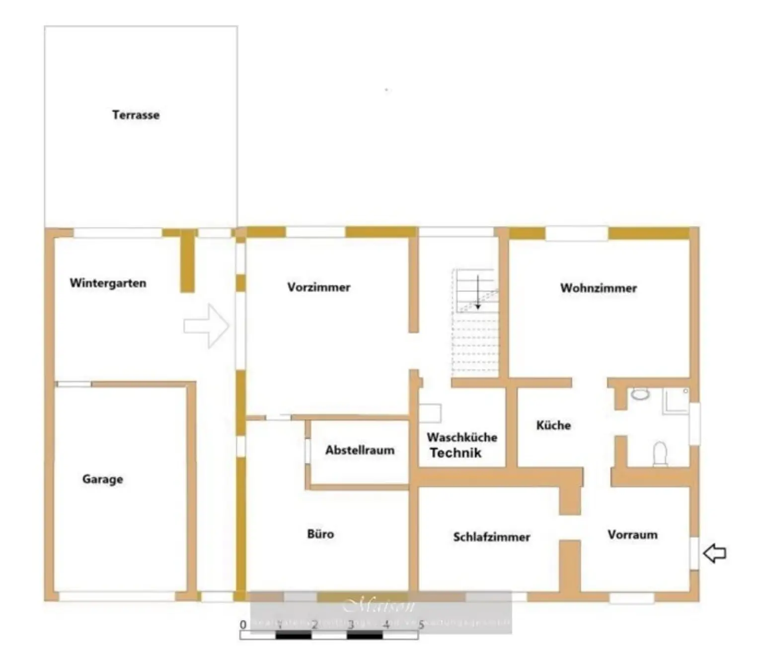 Erdgeschoss: Eingangsbereich, Wintergarten, Vorzimmer, Abstellraum, Büro, Waschküche/Technikraum, Stiegenhaus, 30m² Terrasse, Doppelgarage und die separate Einliegerwohnung.