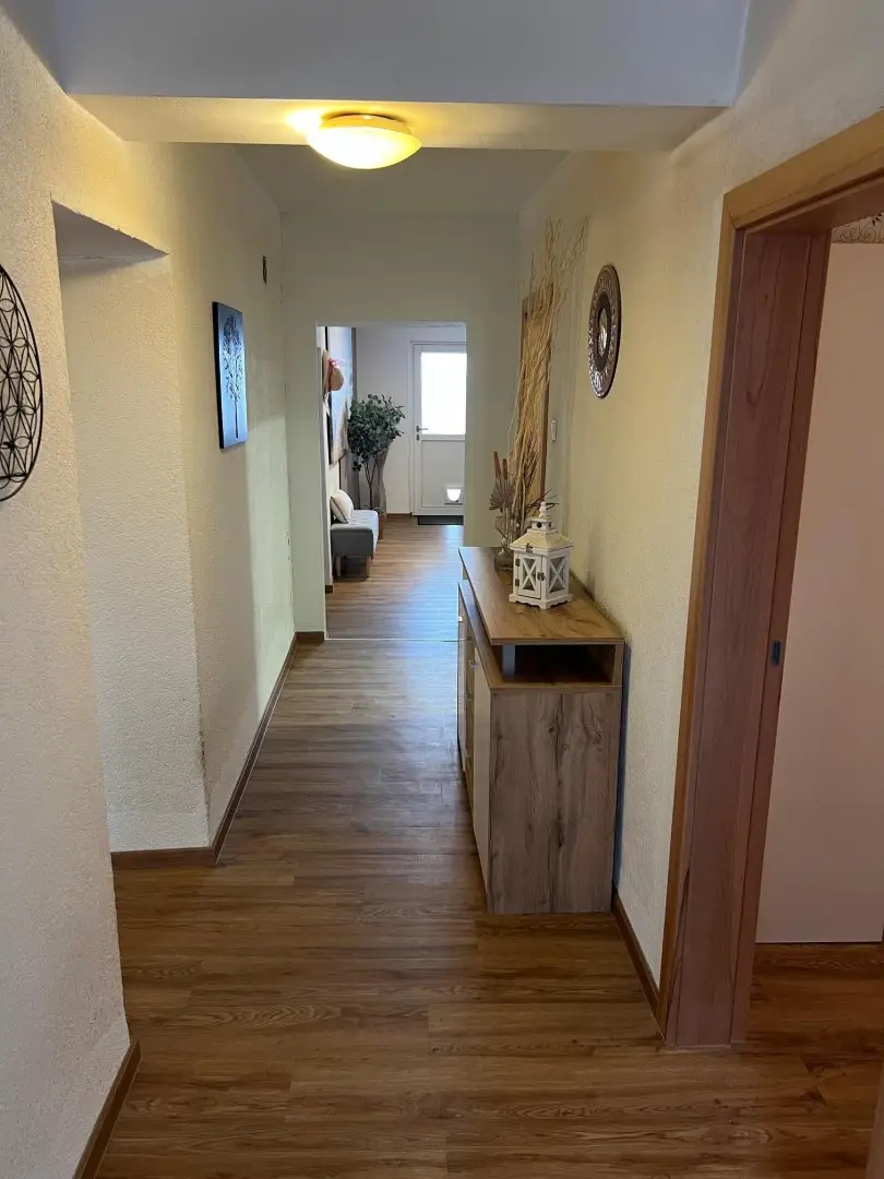 1. OG: 4 Zimmer, großes Badezimmer, WC, Flur und gr. Balkonterrasse.