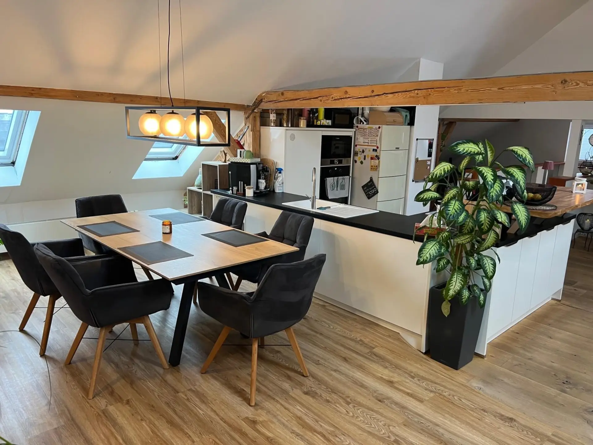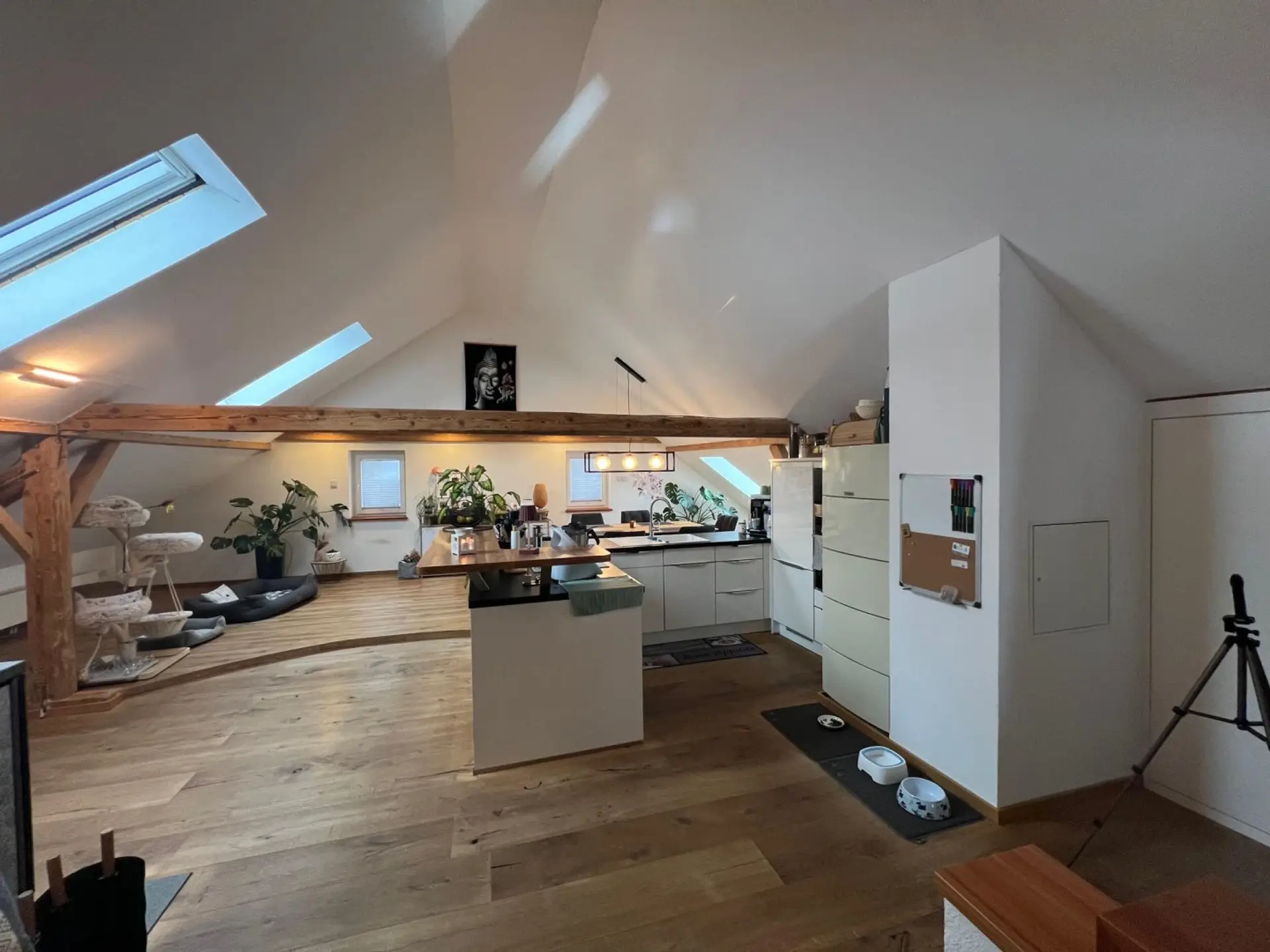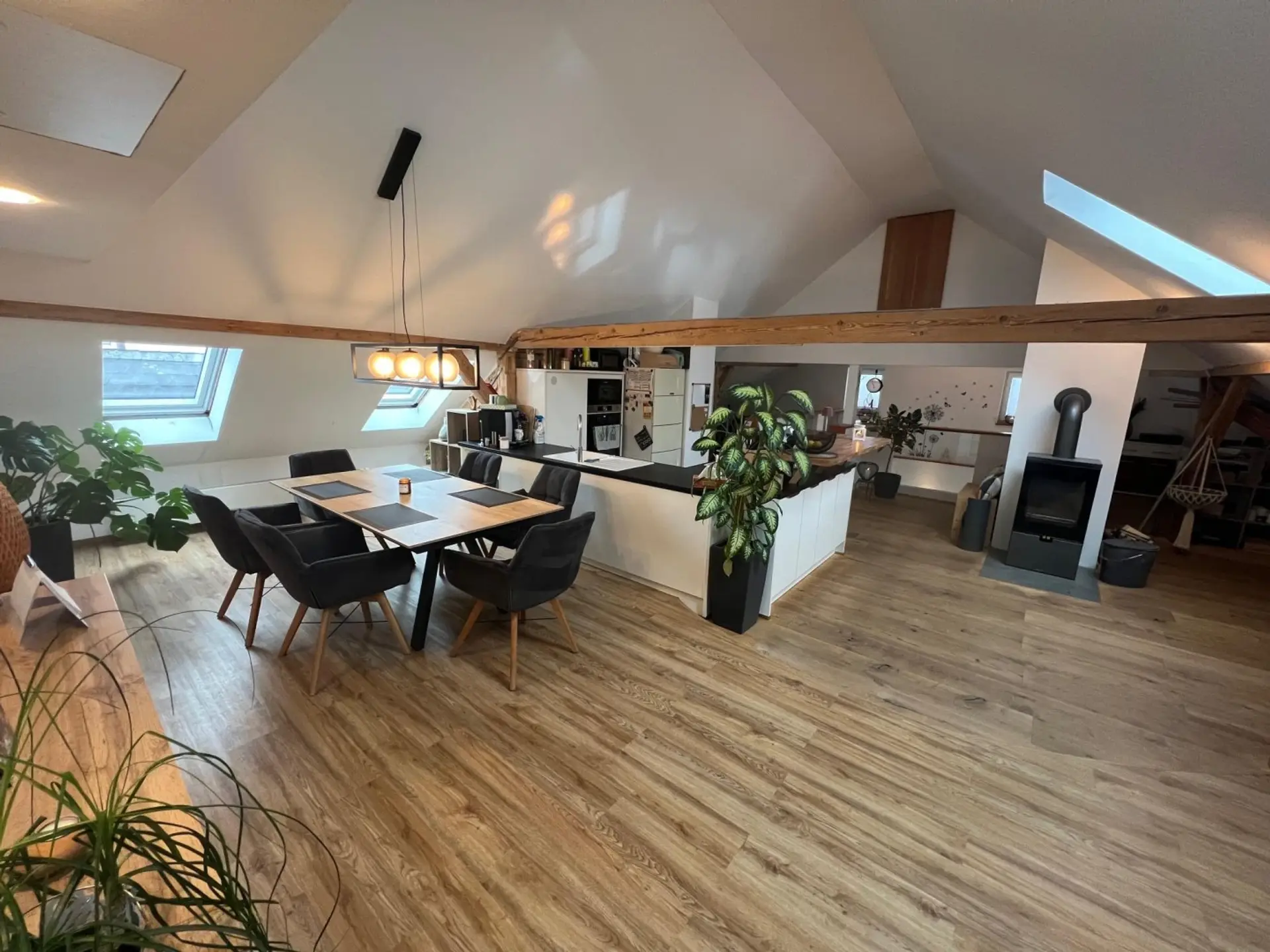 Dachgeschoss: sehr großer Wohn-/Essbereich mit Küche und Schwedenofen, Speis.