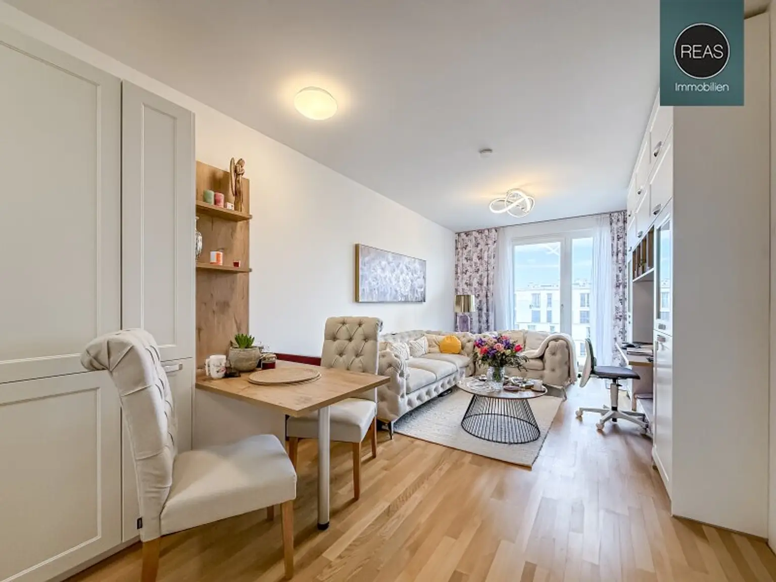 * 1 Wohn-Esszimmer mit Einbauschrank und Ausgang zum Balkon
