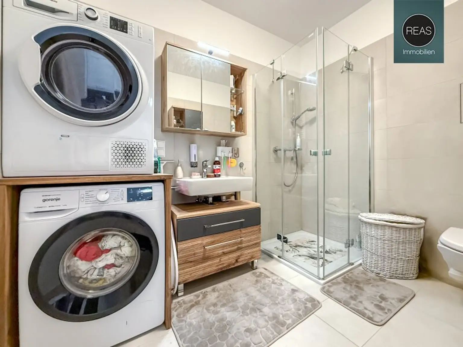 * 1 BAD/WC mit Dusche samt Glaswand, WC, Waschbecken, Handtuchheizkörper sowie einem Waschmaschinenanschluss