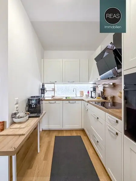 * 1 Küche mit hochwertiger Einbauküche inkl. aller Geräte (Kühl-Gefrierkombi, E-Herd, E-Backofen, Dunstabzug, Geschirrspüler, Spüle) sowie einem Essbereich samt Tisch