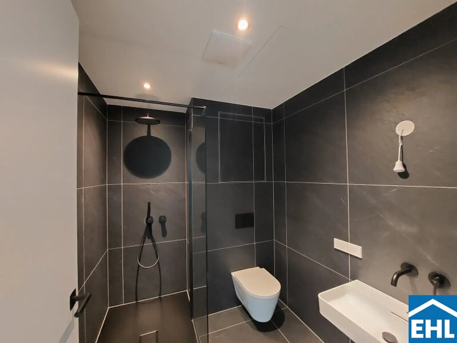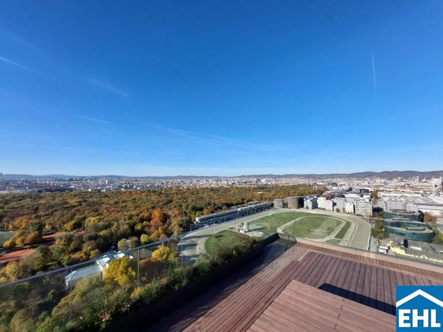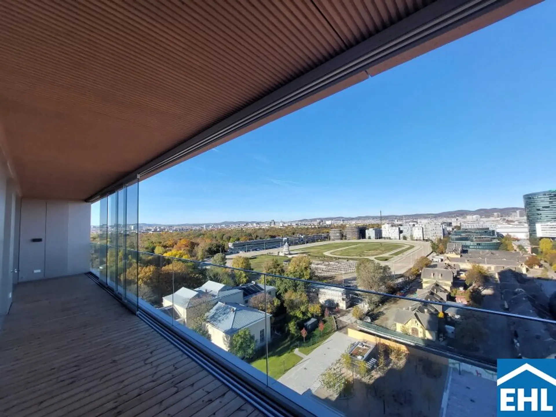 Ein weiteres Highlight ist die Freifläche, von der sich nicht nur ein herrlicher Blick über die Trabrennbahn, sondern auch ein weiter Blick über die Stadt eröffnet – vorbei am ehrwürdigen Rathaus, dem stolzen Stephansdom und bis hin zum lebendigen Prater – die 20 m² große Loggia erweitern den Wohnraum nach draußen und machen den Alltag luftiger: Frühstück in der Morgensonne, ein Glas Wein am Abend oder ein Rennen auf der Trabrennbahn Krieau.