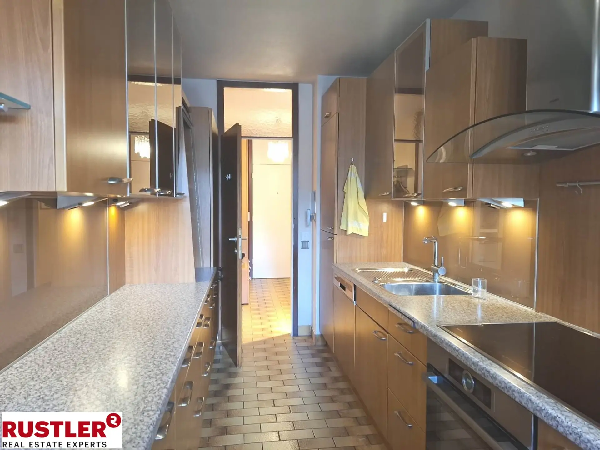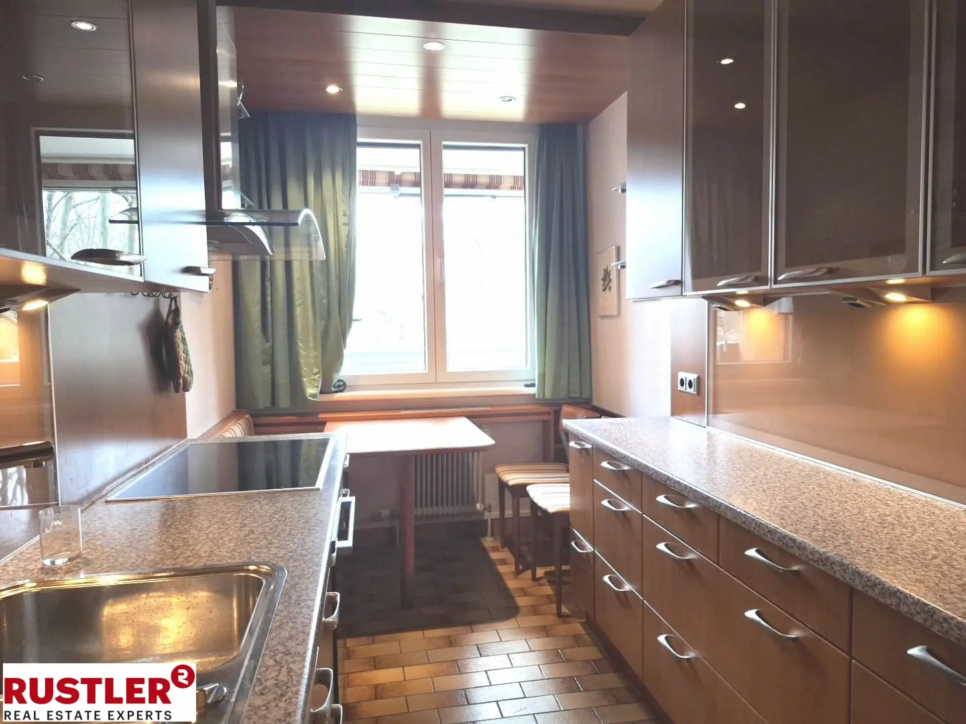 Die gepflegte Einbauküche in zeitloser Holzoptik ist mit sämtlichen Geräten ausgestattet und überzeugt durch großzügige Arbeitsflächen. Ein gemütlicher Essplatz am Fenster, direkt angrenzend an die Loggia, schafft eine helle und freundliche Atmosphäre und kann zudem als praktische Durchreiche genutzt werden.
