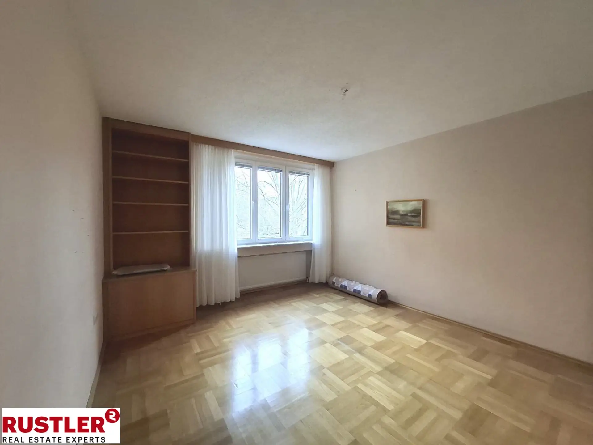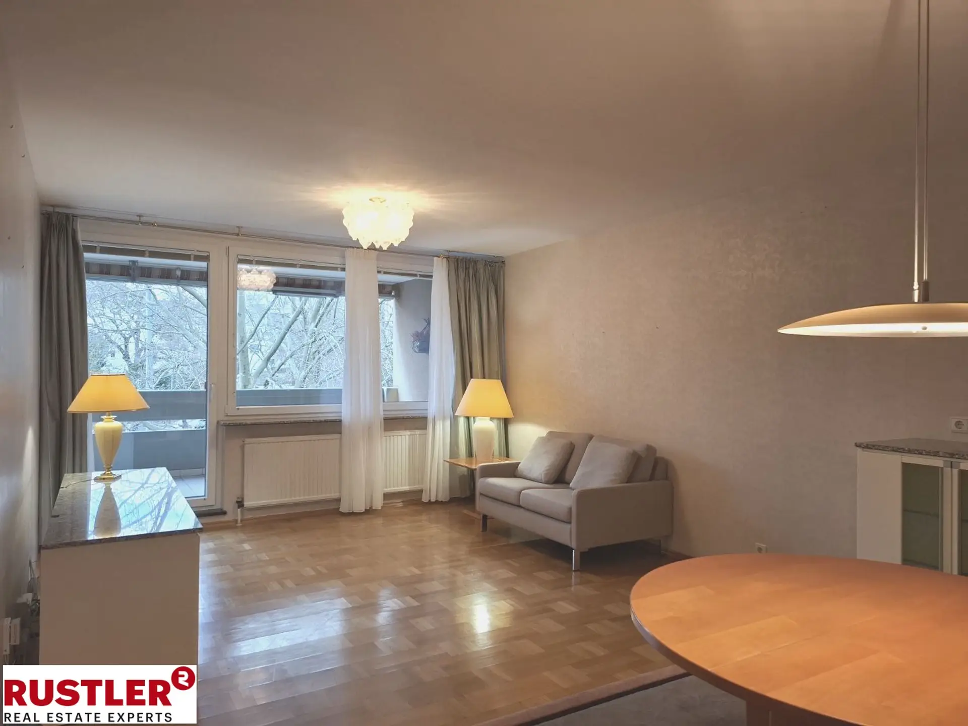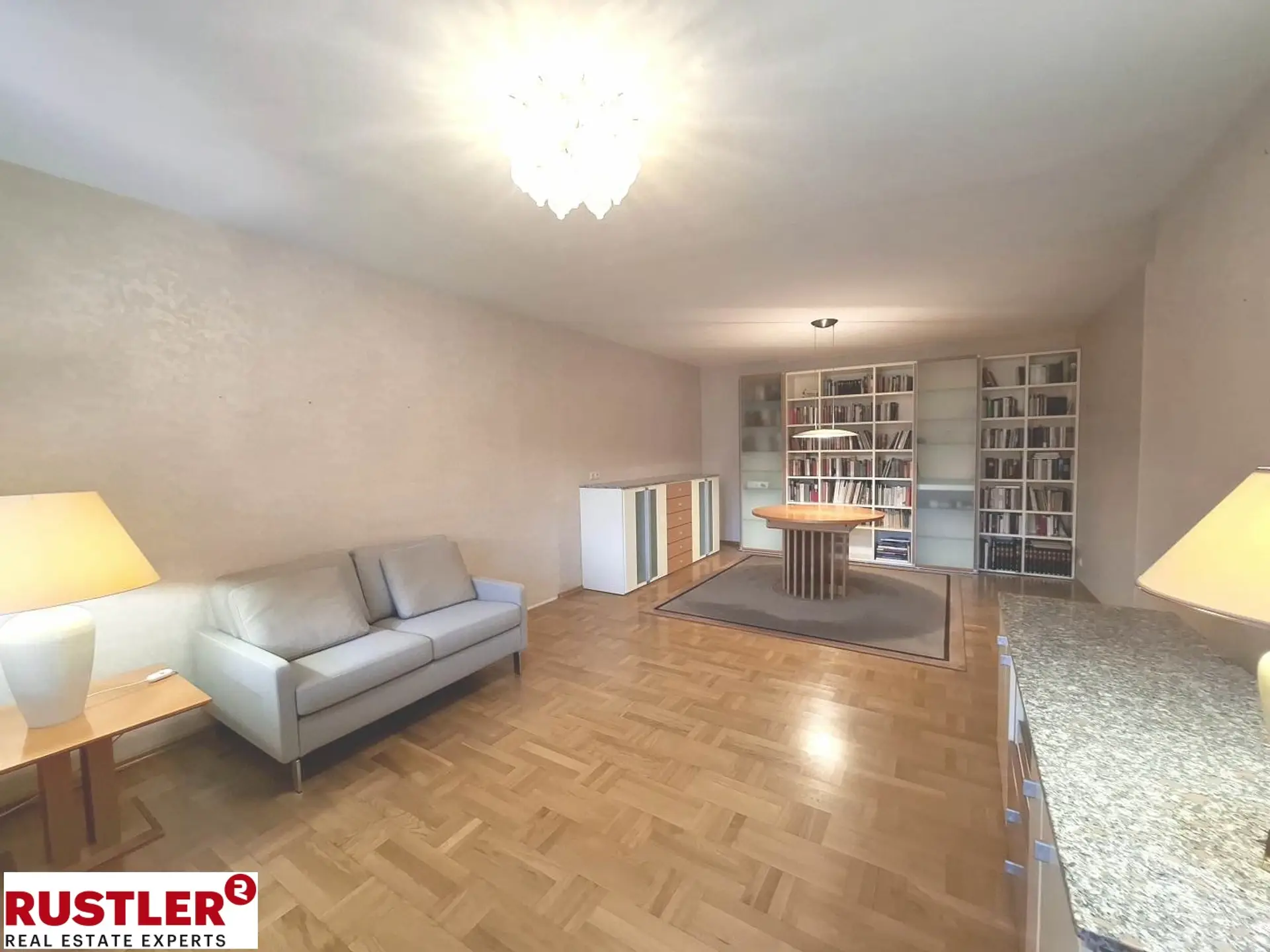Herzstück der Wohnung ist der lichtdurchflutete Wohnsalon mit hochwertigem Parkettboden, der eine warme und einladende Atmosphäre vermittelt. Von hier aus gelangen Sie direkt auf die westlich ausgerichtete Loggia, die durch große Bäume blickgeschützt ist und in den Nachmittags- sowie Abendstunden von stimmungsvoller Sonne durchflutet wird.
