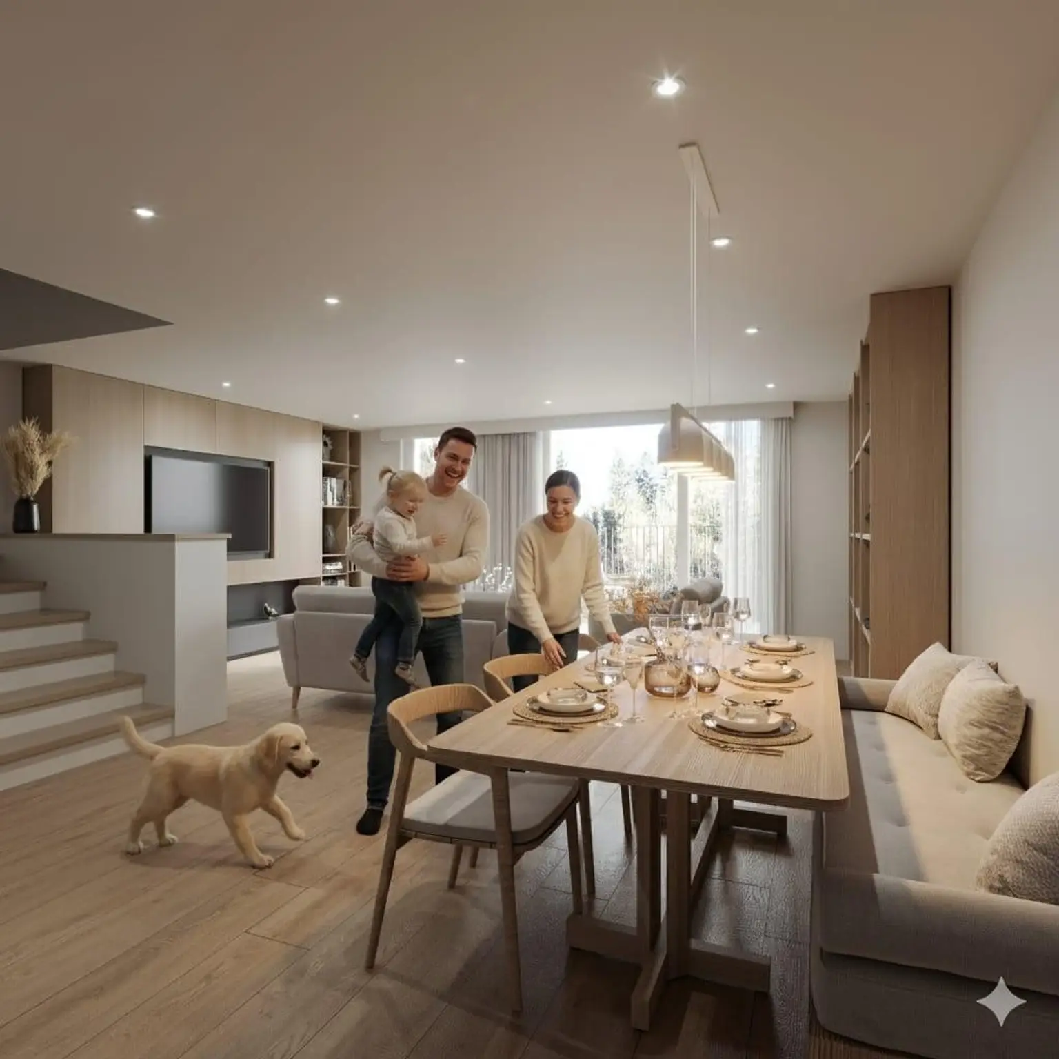 Wohn- & Essbereich: Ein offener, kommunikativer Hauptraum bildet das Herzstück der Wohnung – perfekt für gemeinsame Mahlzeiten und Familienleben.