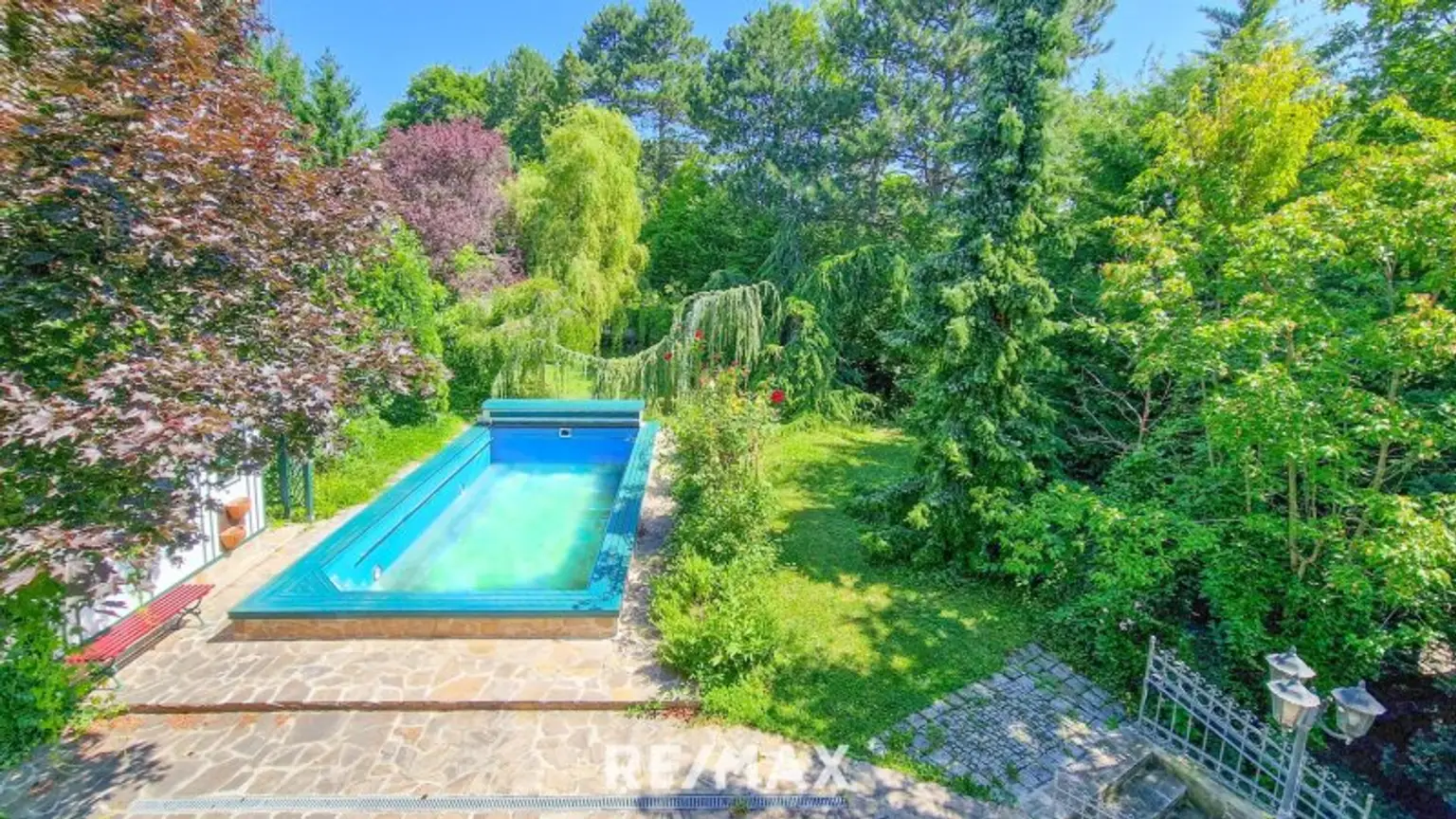 Windfang, Vorraum/Stiegenhaus, großzügige Diele, Wohnzimmer mit offenem Kamin und Erker, Wohnküche mit Kachelofen und Zugang zur Gartenterrasse sowie in den Garten, Zimmer mit angeschlossenem Vorzimmer, Balkon und kleinem Bad (Duschkabine und Waschtisch), Gästetoilette mit Waschtisch und zwei Fenstern. Großzügiger Garten mit wunderschönem Altbaumbestand, großem Pool (beheizbar über Solaranlage und ausgestattet mit elektrischer Lamellenabdeckung), Badehäuschen, Gartenhäuschen und Gästehaus.